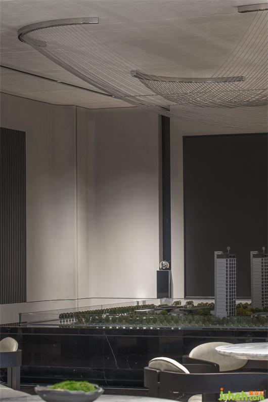 △圖注: 沙盤上方的大型藝術(shù)裝置以歷史悠久的諸暨傳統(tǒng)編織工藝為靈感,售樓處設(shè)計將現(xiàn)代的材料和古老的技藝融合,致敬古老而絢麗多彩的諸暨文化。