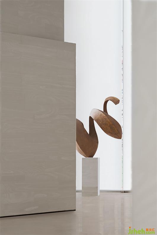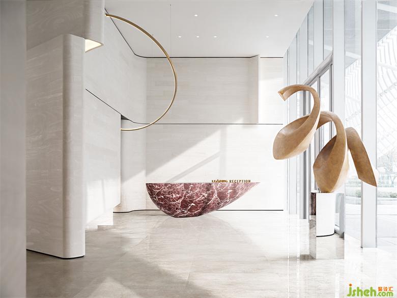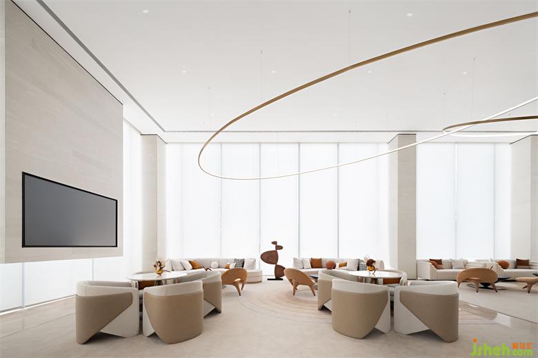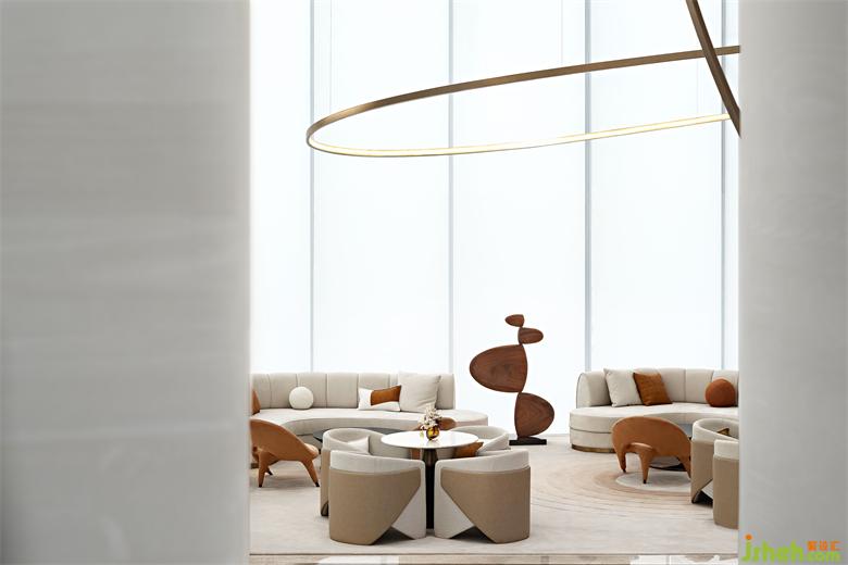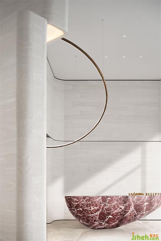整個空間摒棄掉傳統(tǒng)的大型隆重的裝飾吊燈,用裝置藝術(shù)的手法去考慮室內(nèi)燈飾的布陳,大量簡潔干練的弧形環(huán)形的藝術(shù)燈飾穿插其中,猶若星辰運行的軌跡。