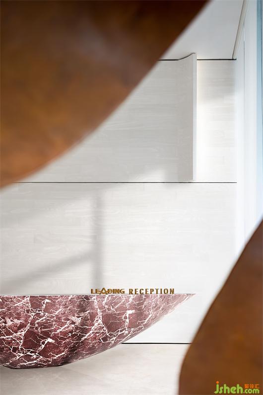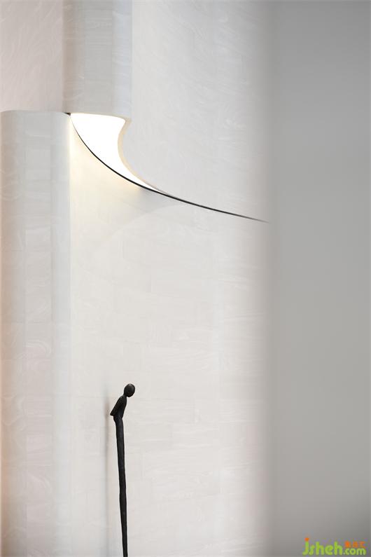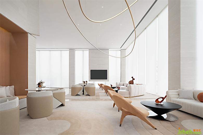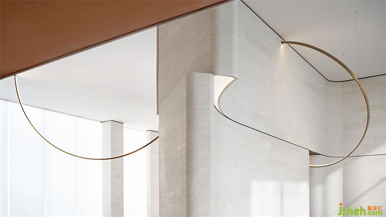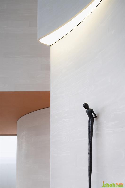 前廳立面柔和自然的弧面構(gòu)造,營銷中心設(shè)計宛如飄逸輕盈的長袖一揮,空間由此變得生動活潑起來,那掀開的一角,讓人對空間產(chǎn)生有趣的錯覺,看不清后方動靜與輪廓,只能從刻意預(yù)留的縫隙中隱約感受到后方光影變動,卻予人一種探究一二的欲望。