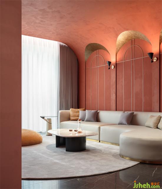 負(fù)一層除了擁有會(huì)議室、報(bào)告廳、多功能影音室外,也預(yù)留了紅酒雪茄品鑒區(qū)。作為整個(gè)小院配色最為濃重的空間,民宿設(shè)計(jì)師希望將紅酒的芬芳馥郁和迷人色調(diào)注入到空間中,因?yàn)橐曈X(jué)可以給人的味覺(jué)、嗅覺(jué)帶來(lái)更深度的體驗(yàn)。