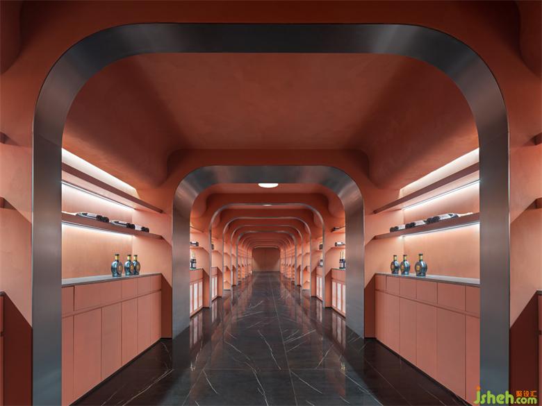 通往臨近建筑的酒窖通道也采用了同樣的配色,黑色大理石地面和金屬序民宿設(shè)計(jì)列的拱券結(jié)構(gòu),給這個(gè)悠長(zhǎng)的地下空間添加了一絲特別的歐洲古堡般的神秘感。