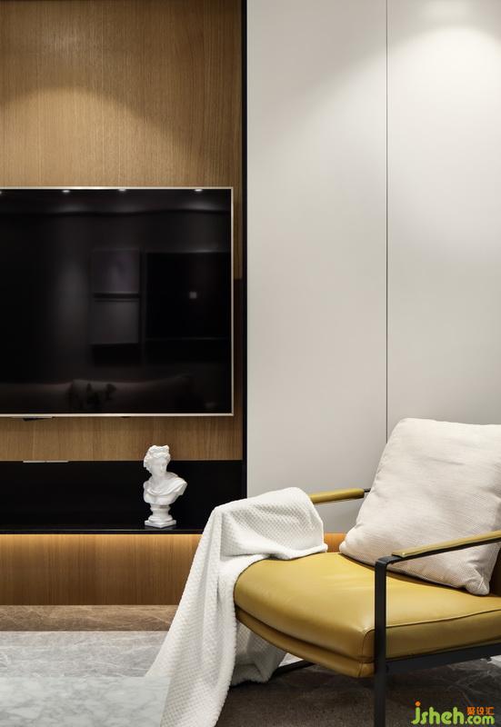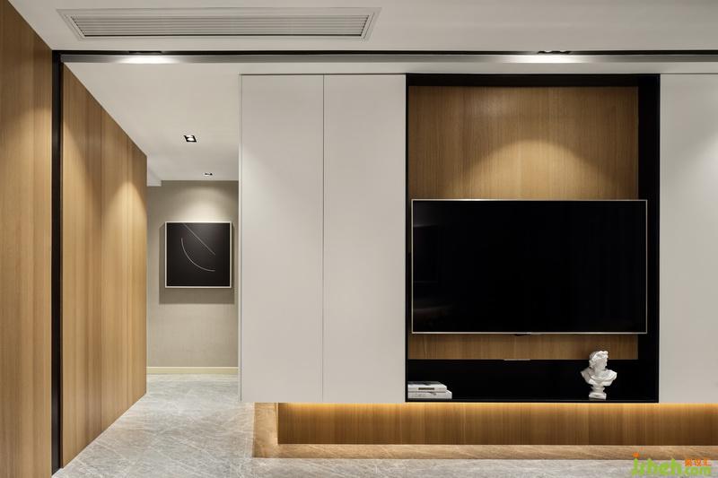 室內(nèi)設(shè)計(jì)師放棄傳統(tǒng)的電視柜,木色、白色比例合理,空間簡約干練。