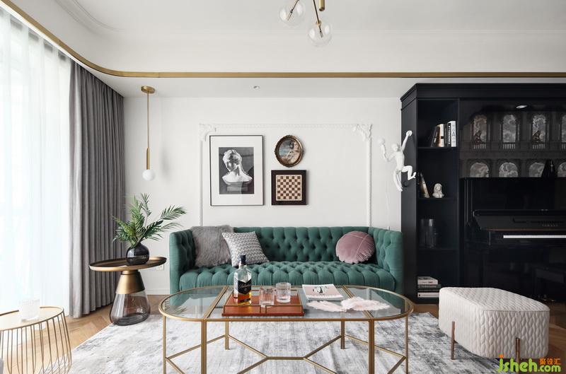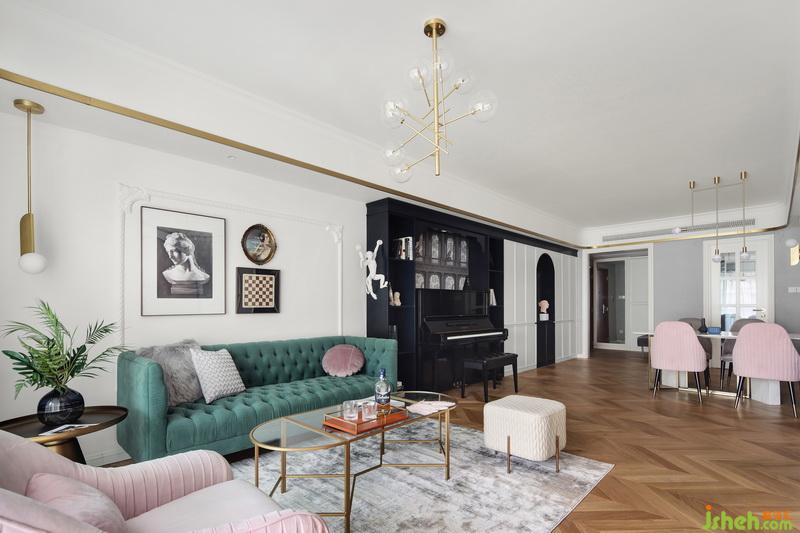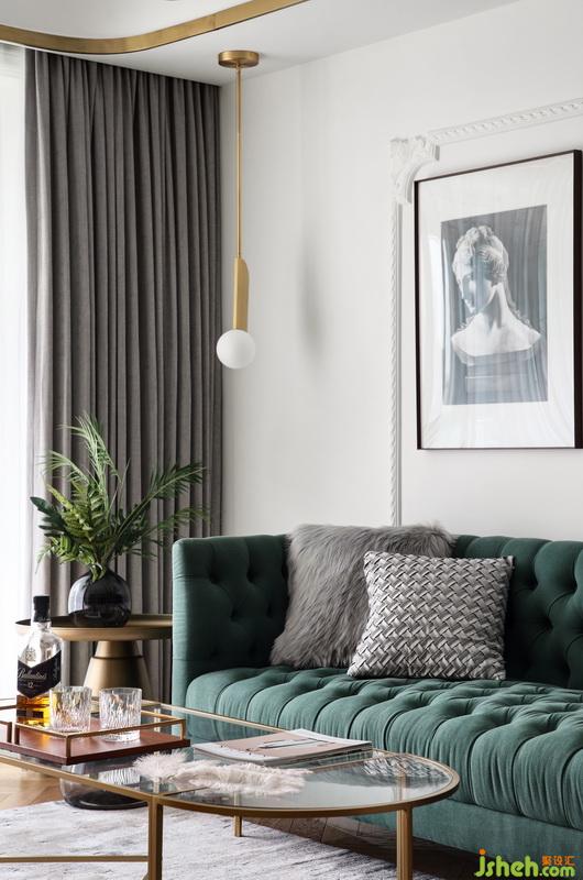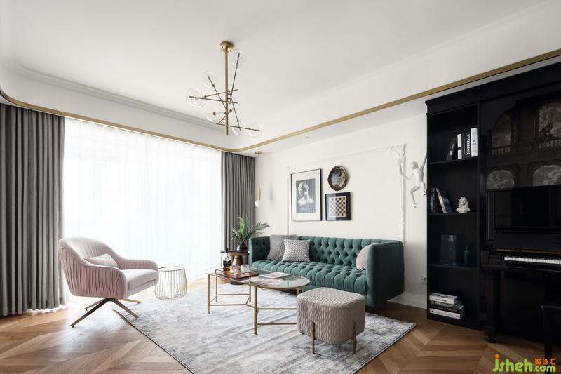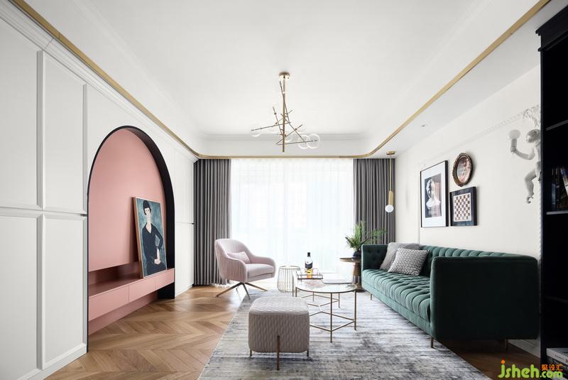 客廳全景??蛷d色彩選用灰粉和灰綠,基調(diào)統(tǒng)一的軟裝飾品呼應主題風格。較網(wǎng)紅的金屬鍍銅小手工磚、水磨石、天鵝絨、魚骨拼地板等,配合弧形造型元素讓整個空間顯得明快且有品質(zhì)。