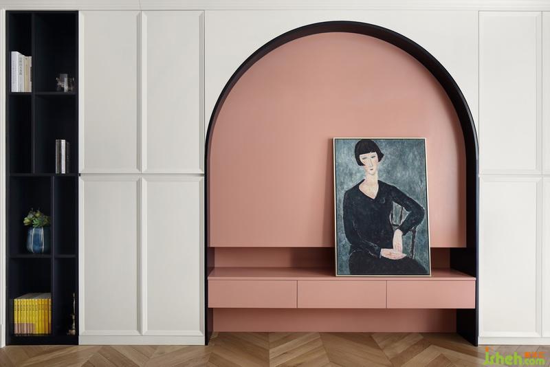 電視柜整體,和諧的配色,大量柜體的設計解決日常雜亂的可能,美感和實用統(tǒng)一。