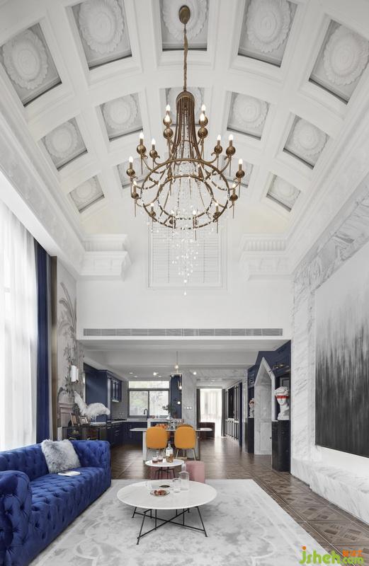 餐廳頂面呼應客廳造型,隱藏中央空調(diào),靠窗的區(qū)域規(guī)劃為水吧臺,左右對稱的柜體內(nèi)置兩個單開門冰箱,從一樓樓梯道回望,空間呈現(xiàn)出一種對稱的秩序美感。