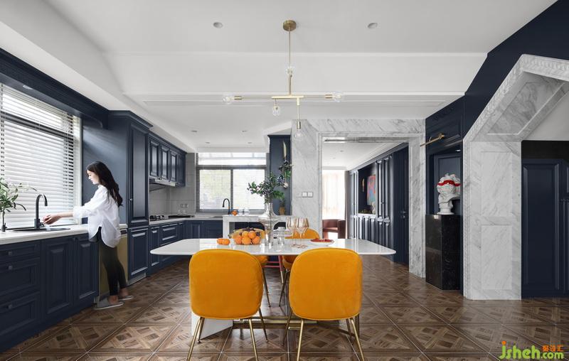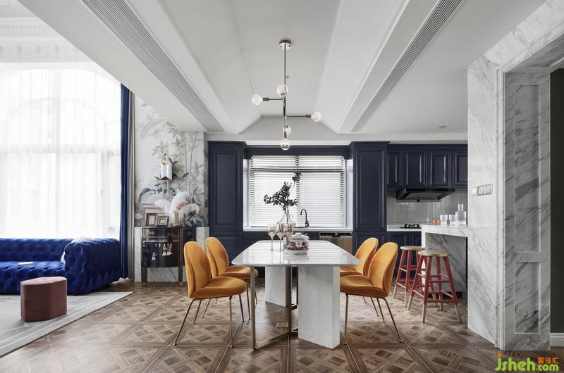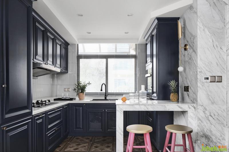 餐廳區(qū)域設置為開放式廚房,搭配水吧臺,從廚房轉(zhuǎn)角延伸出來的臺面滿足兩三個人的簡單就餐需求。