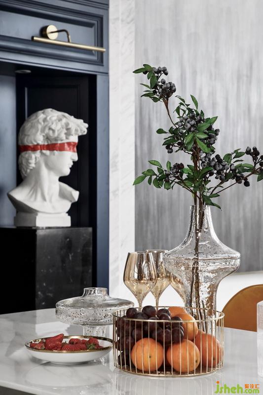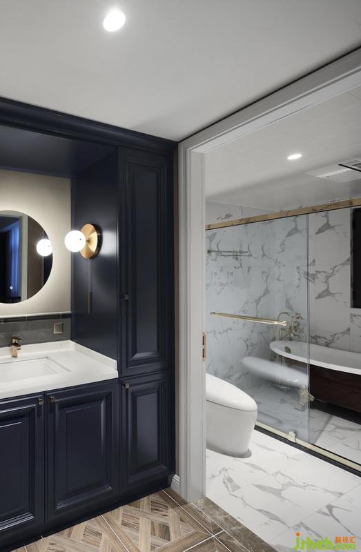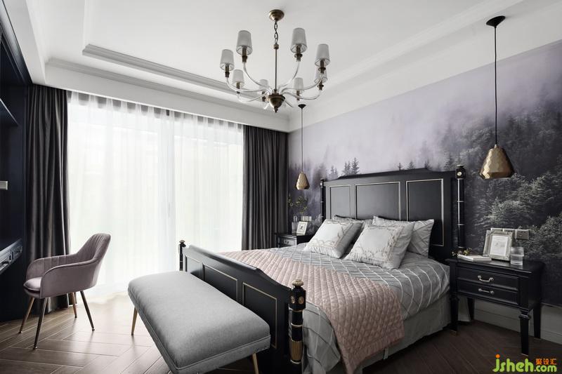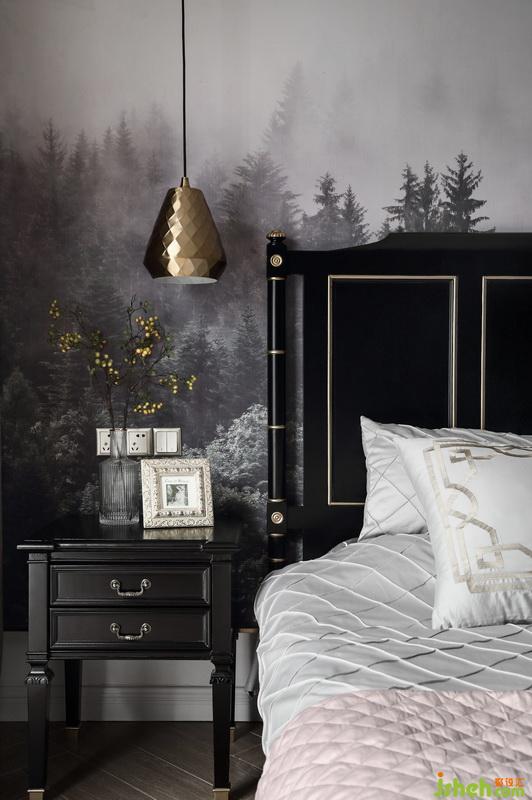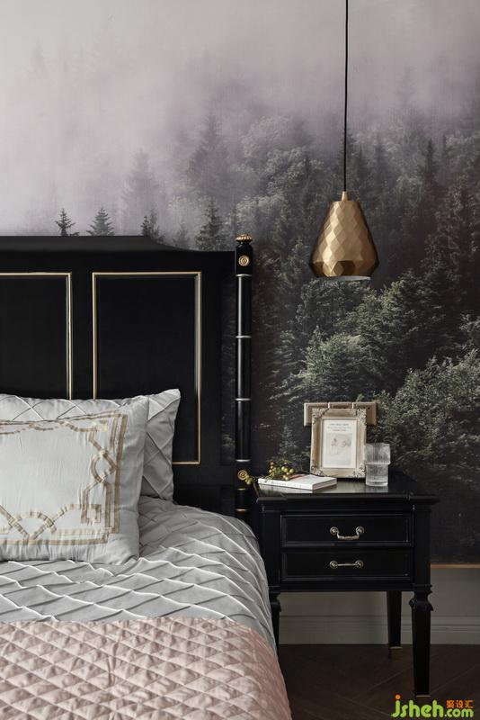 主臥室選用啞光黑漆的美式大床和極具藝術感的迷霧森林墻布,暗藏在床頭墻體里的暖黃燈帶,讓臥室空間在夜幕降臨后散發(fā)出一種雅致迷人的氣息。