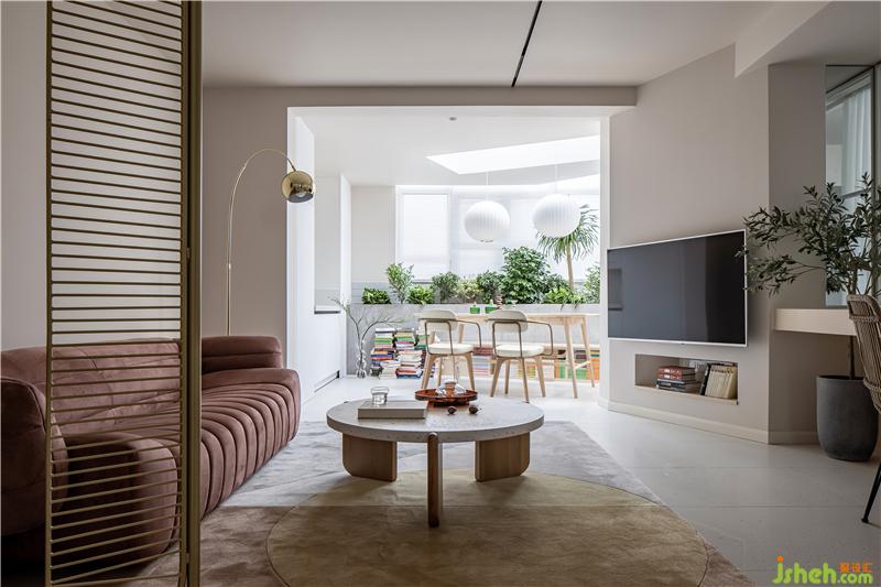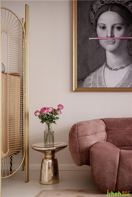 墻頂面使用非常淺的咖色包裹,使用同色系棕色沙發(fā)壓住畫(huà)面,地面采用同色系啞光地磚鋪設(shè),搭配黃銅屏風(fēng)與金色落地?zé)簦臻g使用復(fù)古元素連續(xù)穿插,整體使用大地色系制造溫柔。室內(nèi)設(shè)計(jì)師