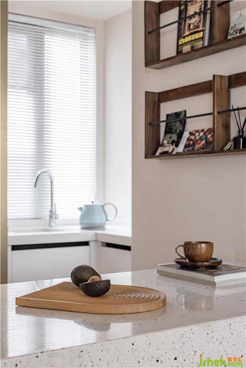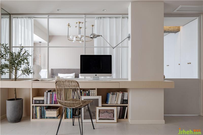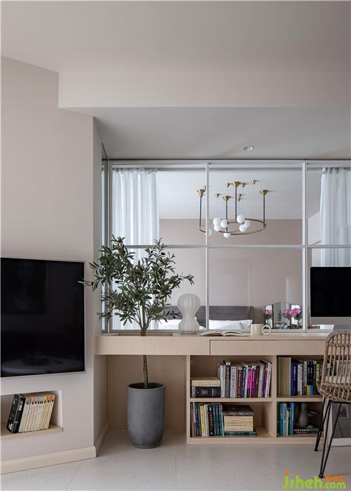 在客廳現(xiàn)場(chǎng)制作可供兩人使用的辦公寫字臺(tái),下方用書(shū)柜支撐,寫字臺(tái)也起到劃分客廳與臥室的功能,弱化電視背景,整體為業(yè)主量身打造。寫字臺(tái)下方書(shū)柜放置常用備課書(shū)籍,客廳與臥室之間僅用通透玻璃紗簾分隔。室內(nèi)設(shè)計(jì)師