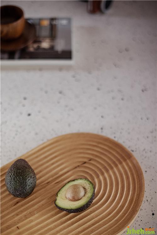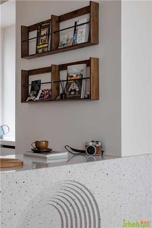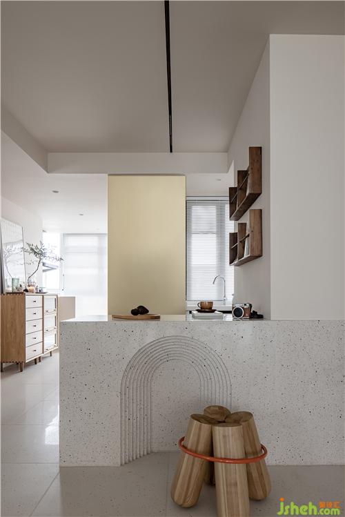 水吧臺(tái)采用水磨石一體化造型臺(tái)面及側(cè)板,立面內(nèi)凹多層拱形,滿足美觀同時(shí)亦可為矮凳提供放腳區(qū)域,矮凳可兼做換鞋凳,吧臺(tái)背景使用金色銅板包墻和整個(gè)空間進(jìn)行呼應(yīng)。
