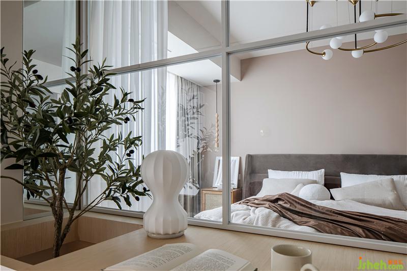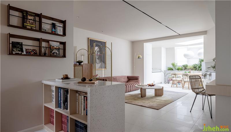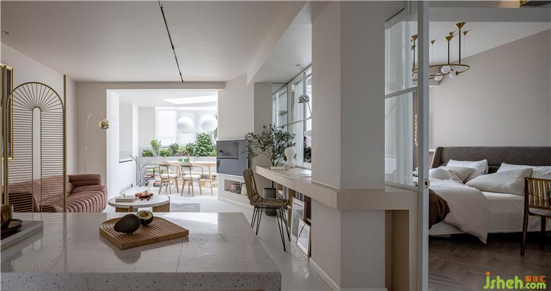 吧臺(tái)區(qū)看向客廳寫字臺(tái)和主臥。