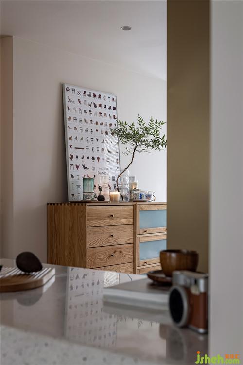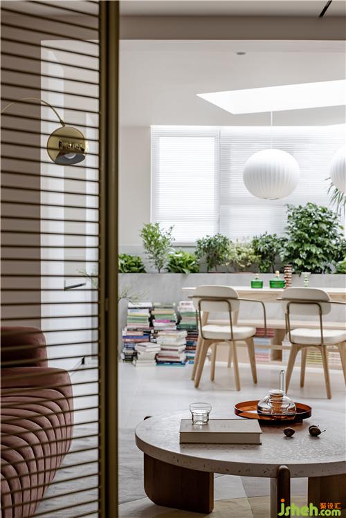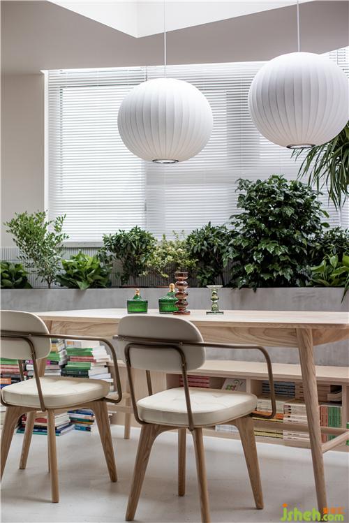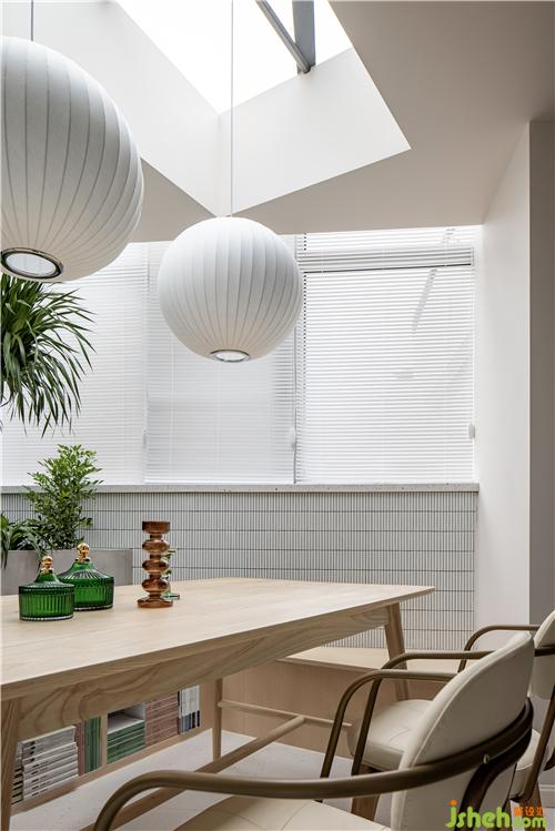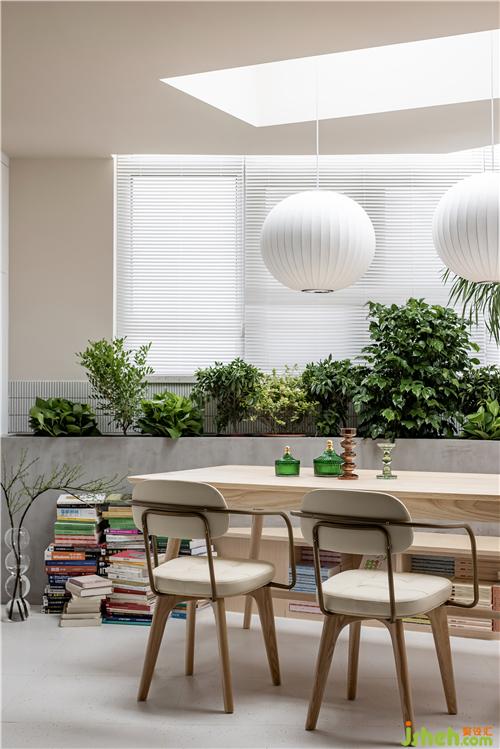 餐廳將戶外陽臺(tái)封閉,開設(shè)天窗,增加植物景觀,下設(shè)木制卡座,集合書柜,搭配原木色餐桌與皮制餐椅進(jìn)行混搭,整體色系將客廳空間與餐廳空間氛圍融合過渡。 餐廳卡座同樣選用原木色搭配,一反復(fù)古常態(tài)。