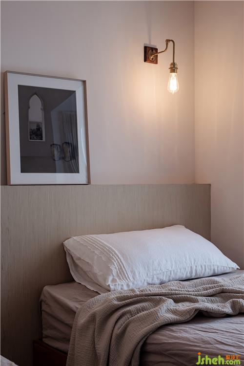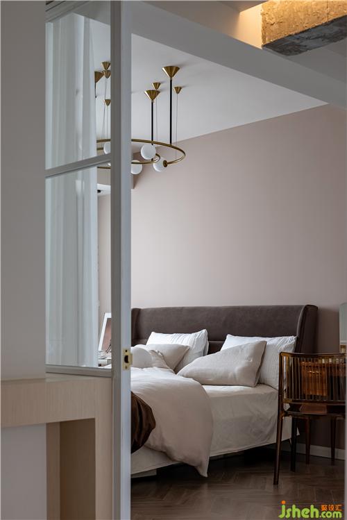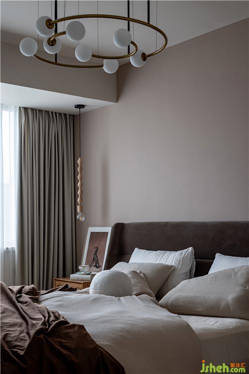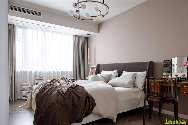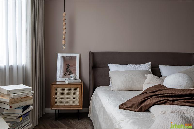 主臥室同樣采用溫柔大地色系和整體進行呼應,咖色絨布床頭和棉質床品,讓家居氛圍更加溫馨。室內設計師