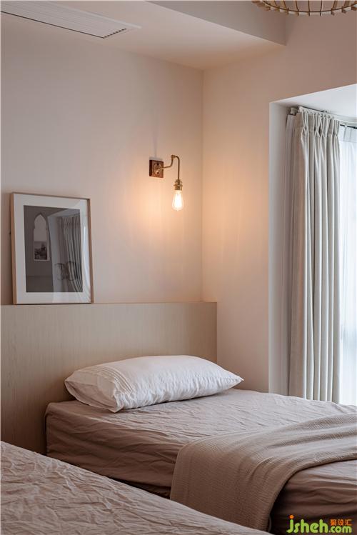 次臥室采用雙單人床設計,方便父母偶爾來住時可分床休息,平時也可二床合一,業(yè)主可在此觀看投影。