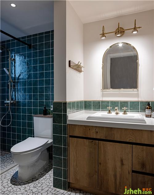 衛(wèi)生間選用墨綠色小方磚和金色五金件進行搭配,溫馨古典。