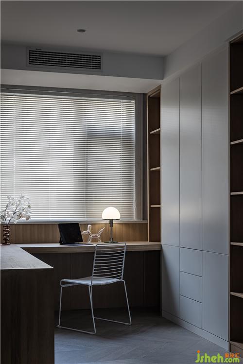 書房開放化設計,超長L型寫字臺可輕松容納兩人同時學習辦公,大量的儲物柜可放置各種書籍及物品。