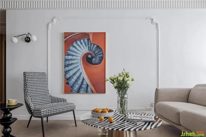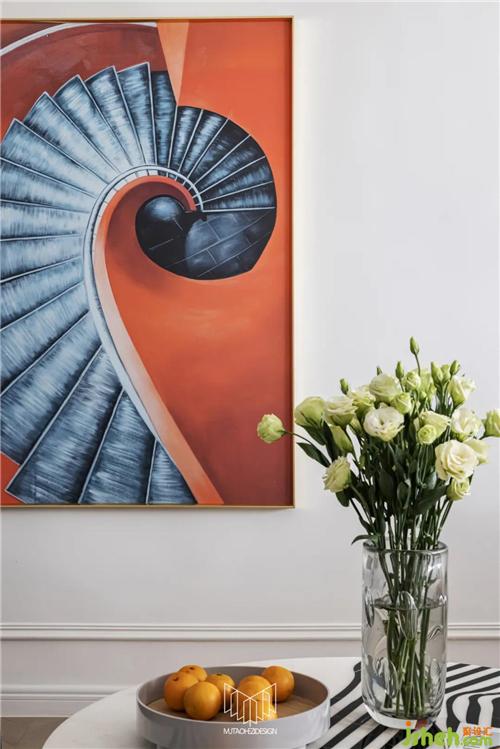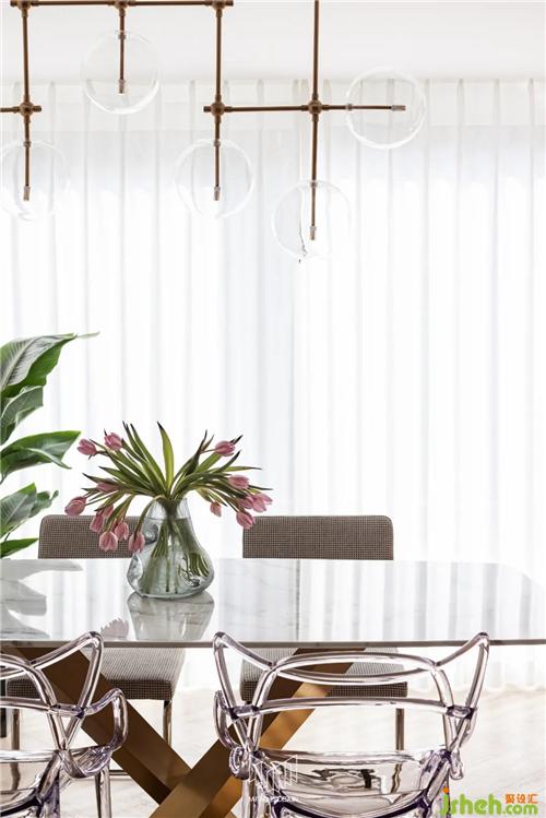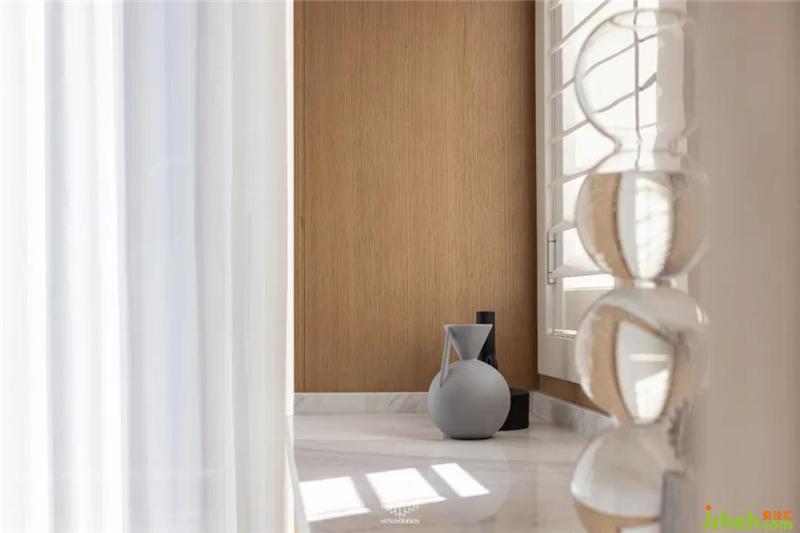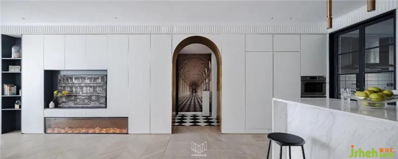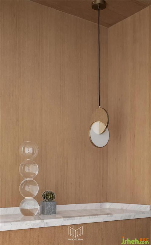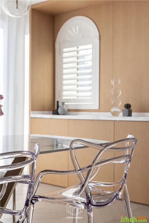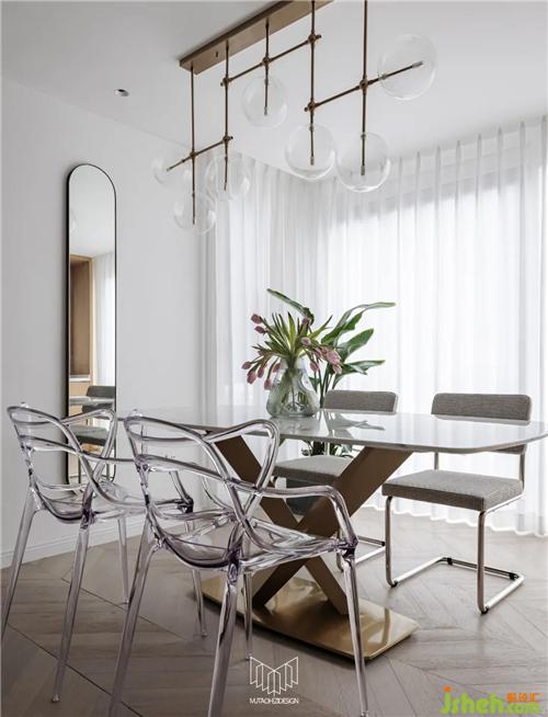 餐廳移至客廳南側(cè),就餐的同時也可以欣賞窗外庭院的風景??蛷d儲藏柜柜體延伸至原陽臺,南京室內(nèi)設計師起到餐邊柜的功能,下方內(nèi)藏洗衣機、烘干機。