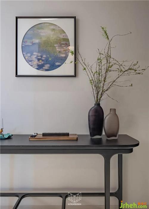 進(jìn)門第一感受:蘇繡勾勒的印象派睡蓮和玄關(guān)桌上的藤蔓狀綠植交相輝映。
