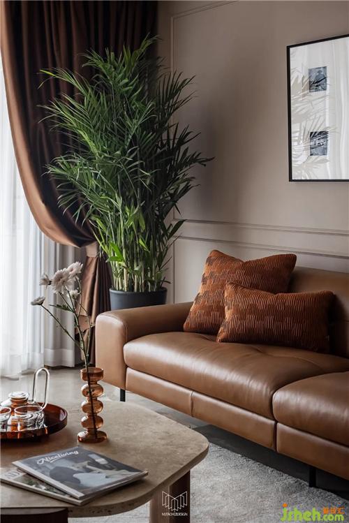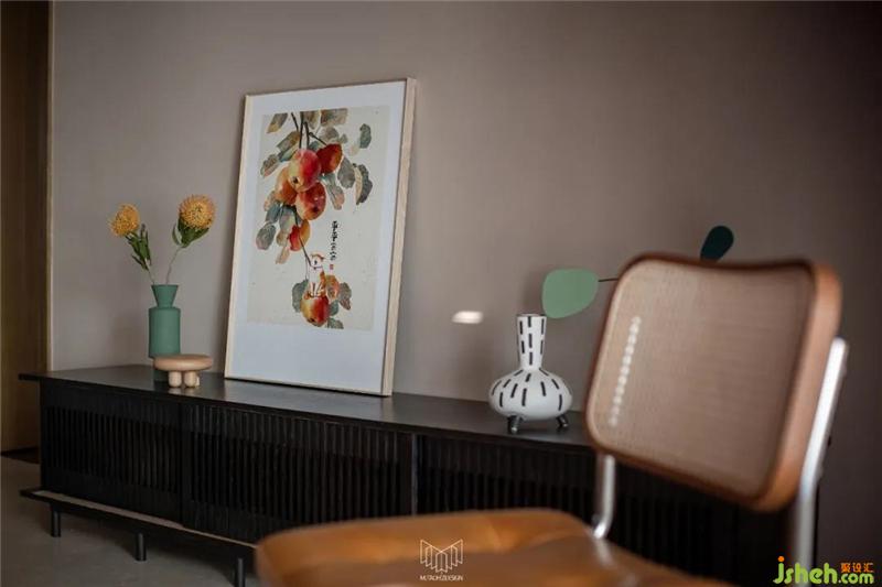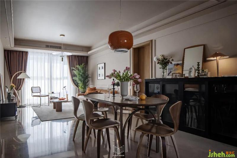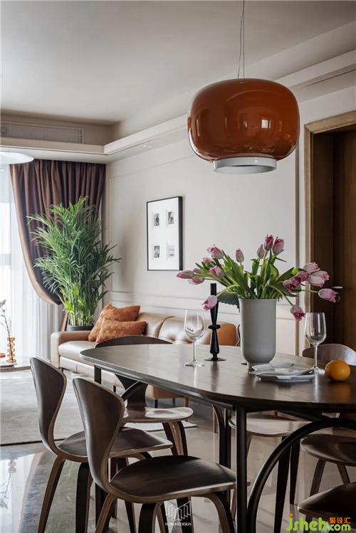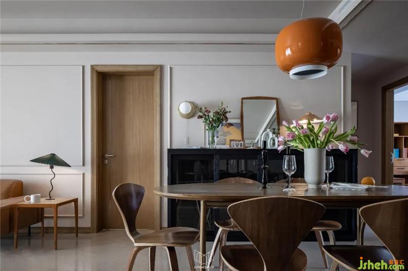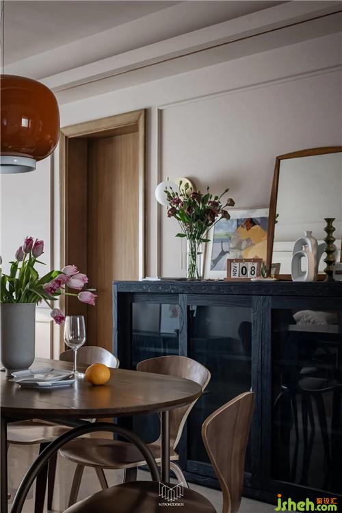 Foscarini Chouchin設(shè)計的橙色蘑菇小吊燈點亮餐廳氛圍。在其一側(cè)搭配Livin/利物因高容量榫卯結(jié)構(gòu)木制黑色餐邊柜,玻璃柜門滿足了女主防止落灰的需求,相對克制裝飾的造型,讓人專注于感受材料本身的氣韻。