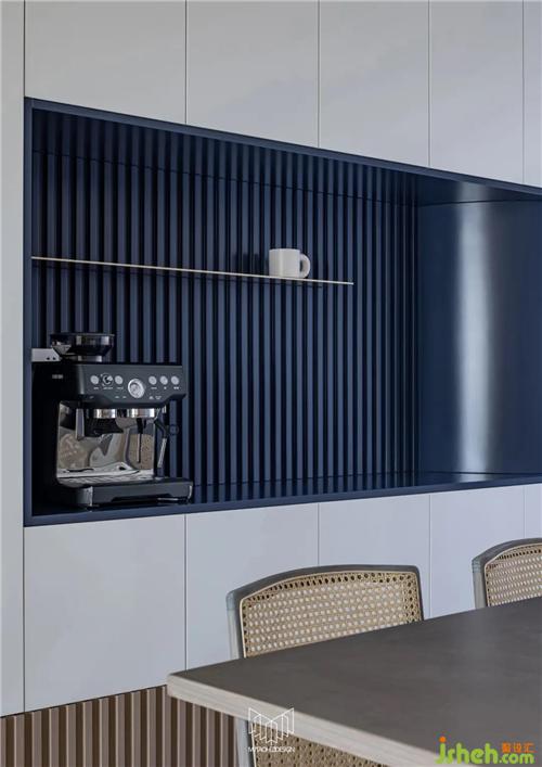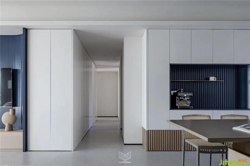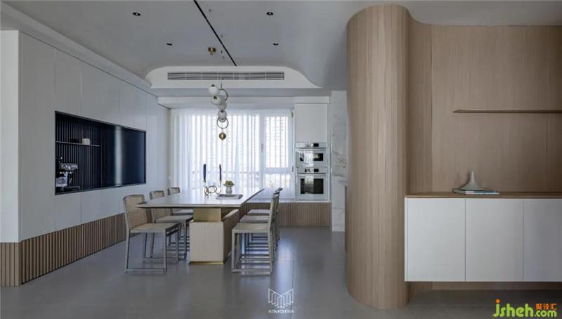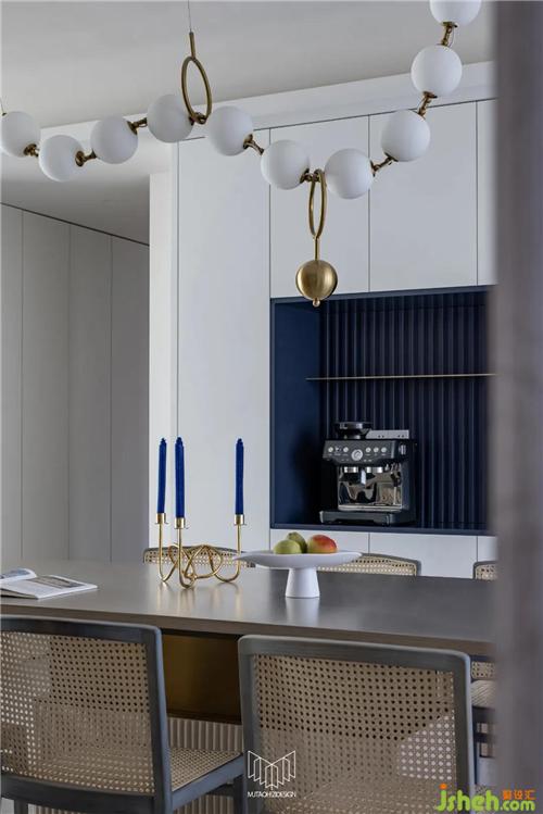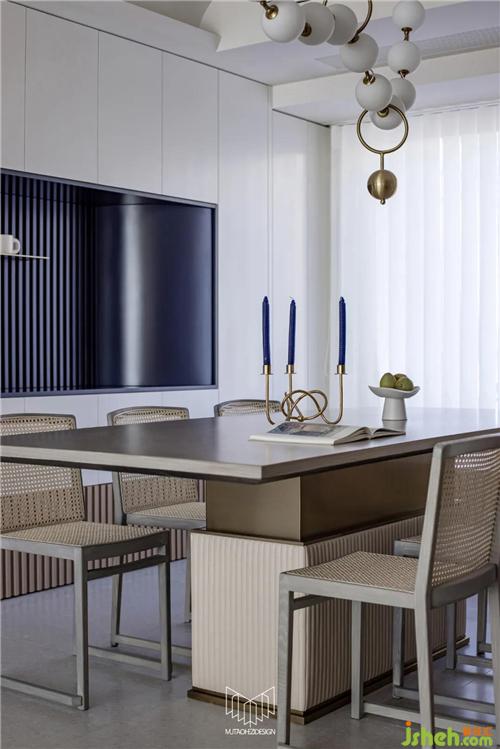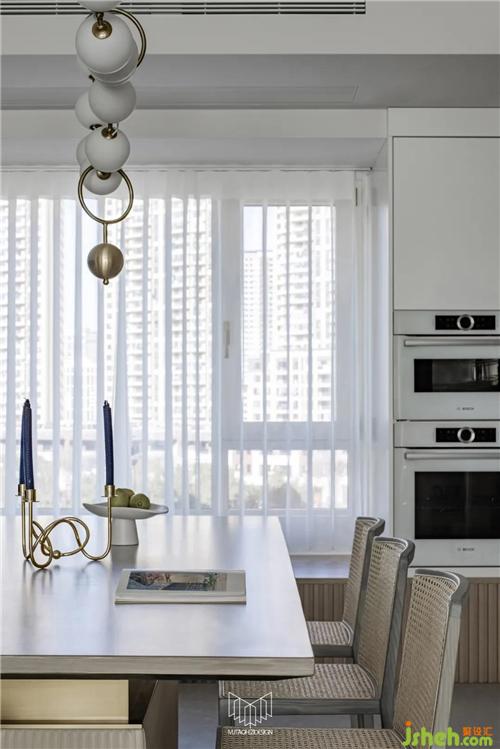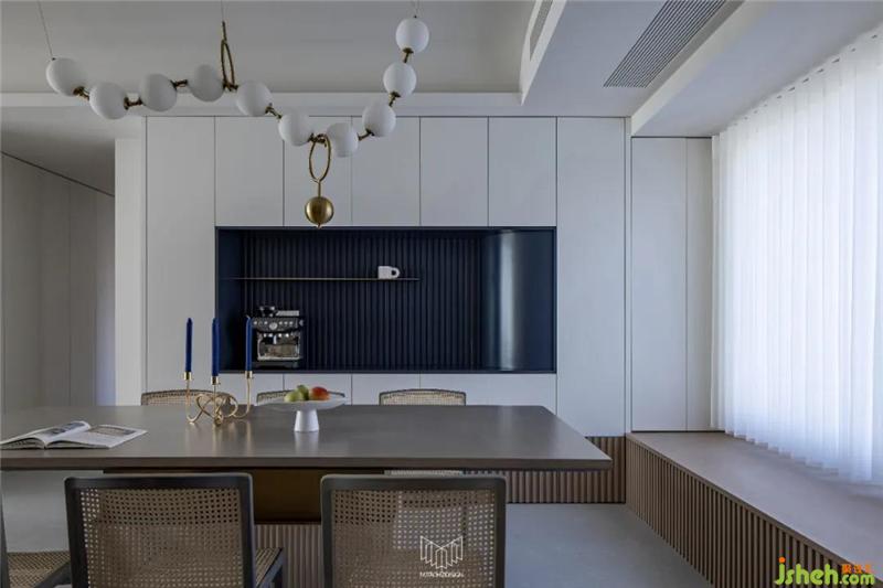餐廳拆除局部墻體并定制島臺(tái),使餐桌和廚房形成洄游動(dòng)線,L型廚房定制內(nèi)嵌式冰箱和蒸烤箱、洗碗機(jī),南京裝修設(shè)計(jì)在豐富功能的同時(shí)使廚房空間干凈整潔,餐廳放置多人餐桌和定制餐邊柜,可容納多人聚餐,并進(jìn)一步增加儲(chǔ)物量。