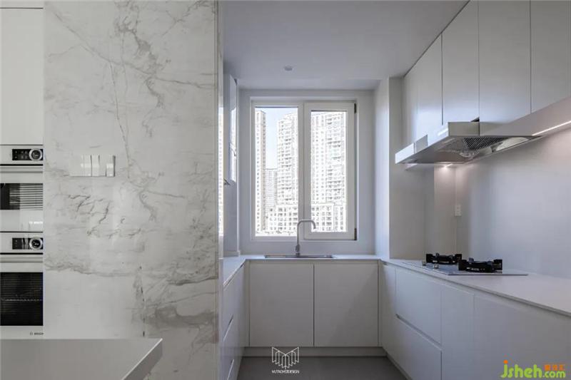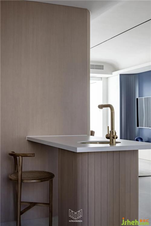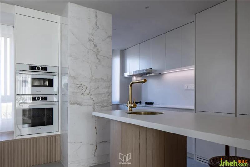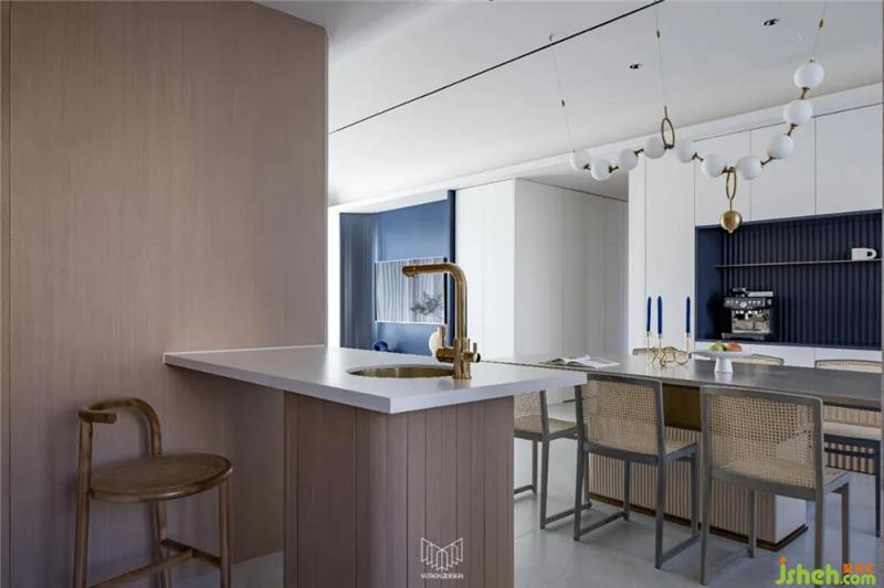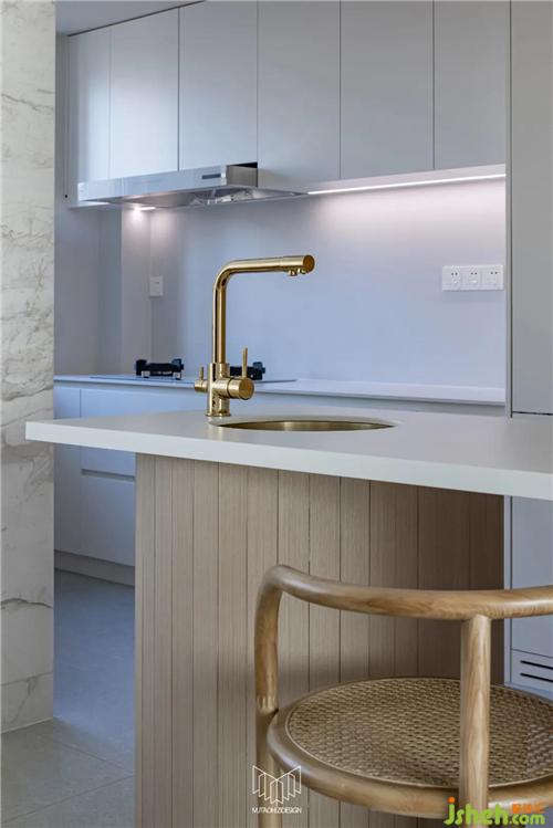 餐廳拆除局部墻體并定制島臺,使餐桌和廚房形成洄游動線,L型廚房定制內(nèi)嵌式冰箱和蒸烤箱、洗碗機,在豐富功能的同時使廚房空間干凈整潔。