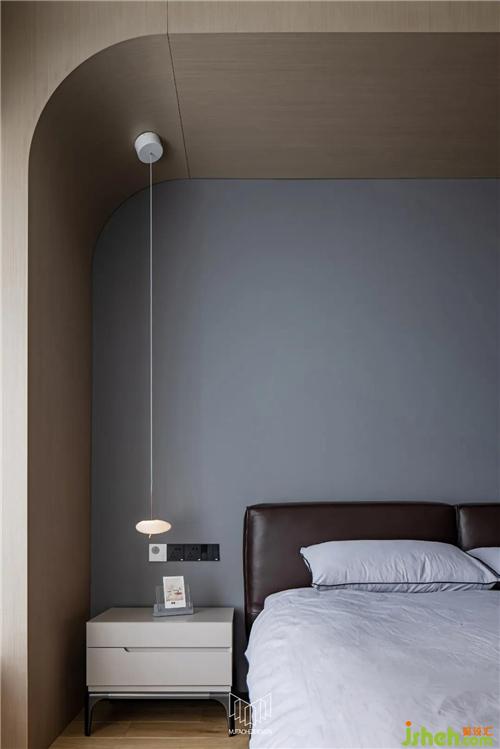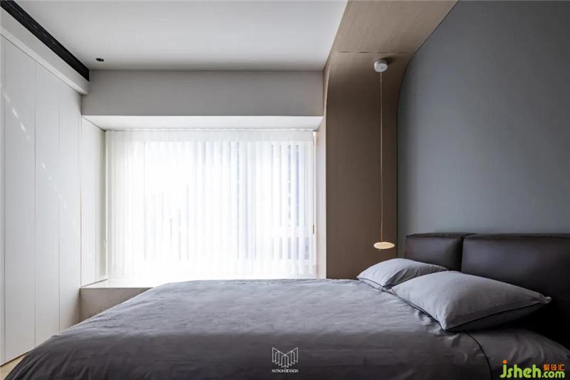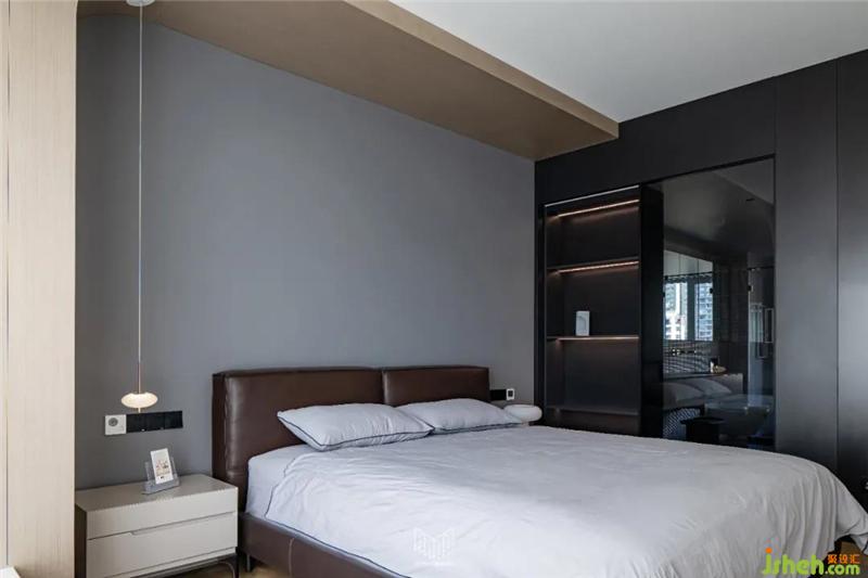主臥室區(qū)域若按照原有結構布局,會致使房間過道面積過于浪費,無法使用。因此通過墻體局部拆除,使得主臥室、主衛(wèi)空間更加整體化,主臥室放置了一張1.8m雙人床,并定制了多組儲物柜,儲物空間得以滿足的前提下,電視機內(nèi)嵌于柜體內(nèi),使空間更加干凈、利落。根據(jù)業(yè)主的喜好,將材質、色彩、光源巧妙融合,營造一種安靜、舒適、愜意的空間氛圍。