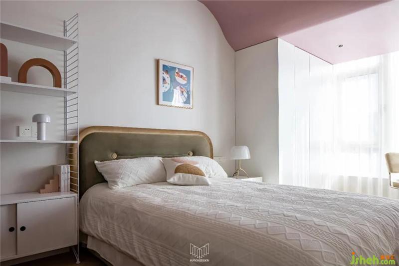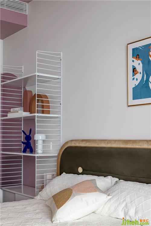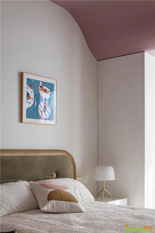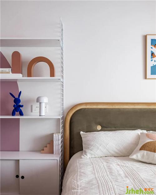 女兒房原有面積較小,考慮到業(yè)主女兒的日常功能需求,將陽臺歸納至房間,并運用流體手法弱化頂面門梁的存在感,在容納鋼琴和書桌的同時多配備一組儲物柜,余下空間更可放置一個與女孩房風(fēng)格相近的成品柜體,借此增加空間的趣味性。