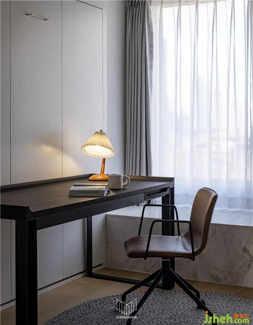 通過分析業(yè)主的生活習(xí)慣和常住人口,書房、客房空間需常以書房功能為主,客房空間為輔,南京裝修設(shè)計通過與材料供應(yīng)商溝通協(xié)調(diào),定制柜體內(nèi)配備墨菲床,在房間常備書桌的情況下兼具睡眠功能。