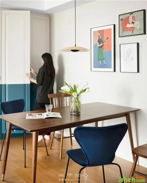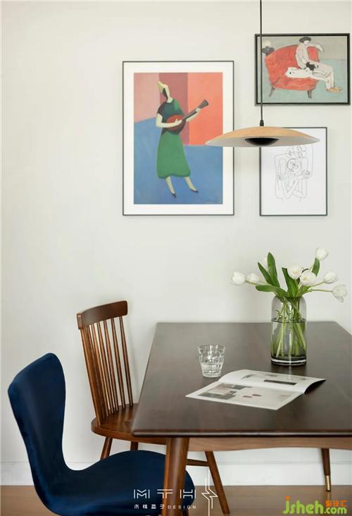 餐廳選用了兩款不同材質(zhì)和造型的餐椅,搭配胡桃木餐桌,既平衡又統(tǒng)一。南京裝修設(shè)計(jì)墻面也選擇色彩跳躍的組合裝飾畫,增添了空間的趣味性。