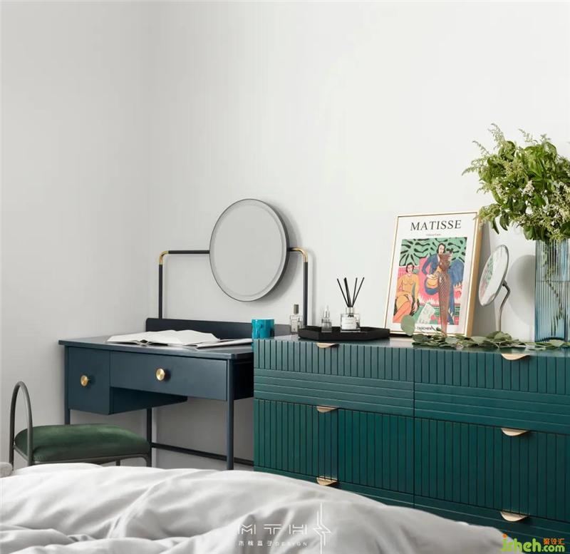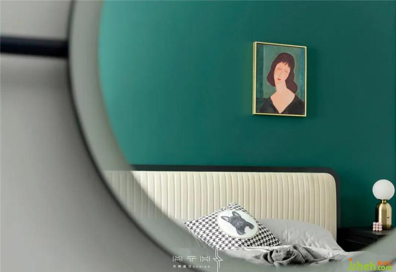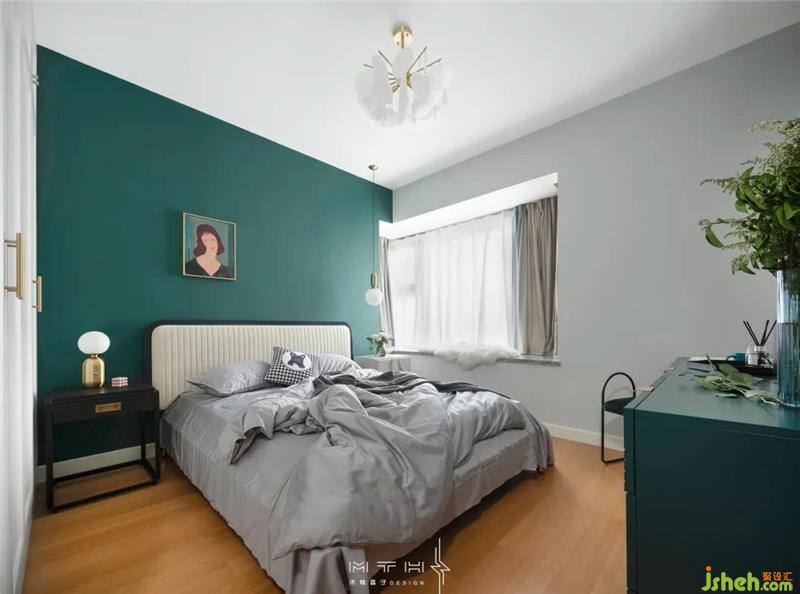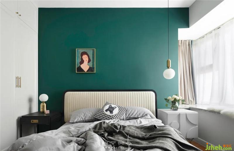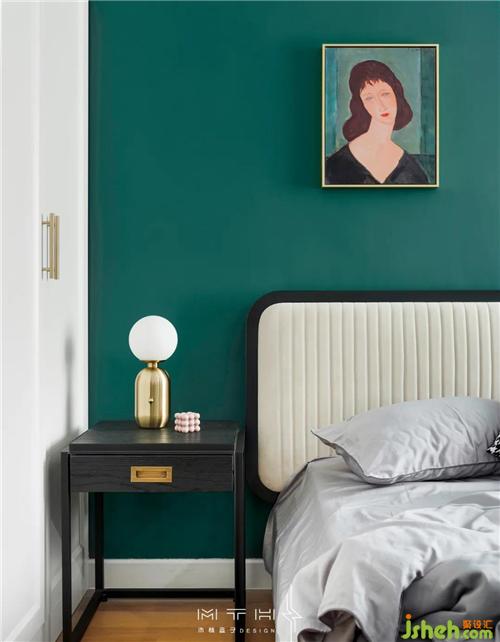 主臥室背景墻整面刷墨綠色乳膠漆,床頭選擇了一幅阿梅代奧·莫迪利亞尼的金色邊框人物肖像畫,畫的背景同樣也是藍(lán)綠色,南京裝修設(shè)計(jì)搭配在一起讓墻面更具層次感。床頭兩側(cè)臺(tái)燈和吊線燈組合布光,也增加了空間的裝飾效果。