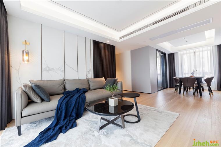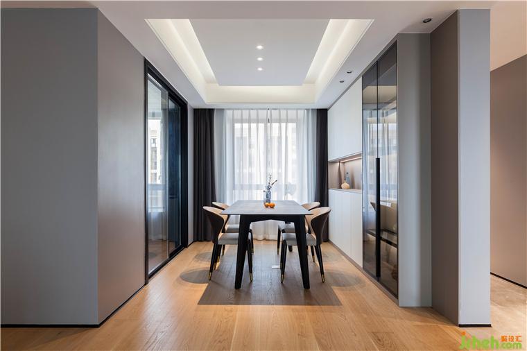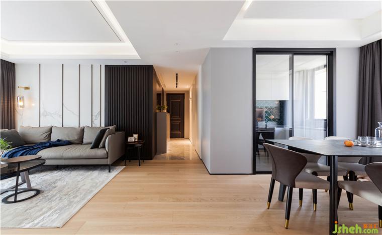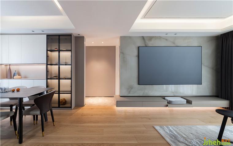 客廳空間氛圍上,希望回到家里有一種柔柔的遼闊包裹自己。把原餐廳位移出,作收納和過(guò)道部分融為一體,以大面積灰色為主,暖地面作為過(guò)渡層次,不至于太冷調(diào),讓整個(gè)空間和色調(diào)簡(jiǎn)約清新又不失溫馨。