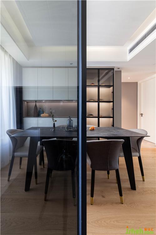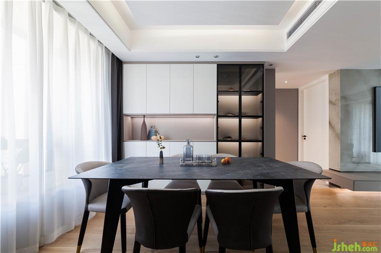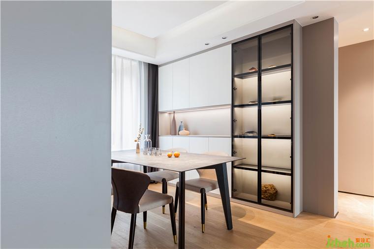 與入戶區(qū)連結(jié)在一起,以地面材質(zhì)作為區(qū)分,互不干擾卻又相互陪伴,配合聚光射燈,夜晚時(shí)分在桌面投下幾個(gè)大大的暖黃光暈,用餐時(shí)光漫漫地溫柔了起來(lái)。
