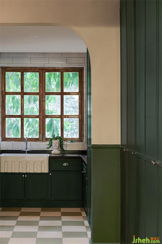 廚房整體以干凈為主,利落的線條和色彩,不同于客廳的濃烈,并使用馬賽克鋪磚和金屬點(diǎn)綴為廚房打造出復(fù)古的時尚感。