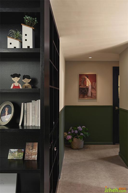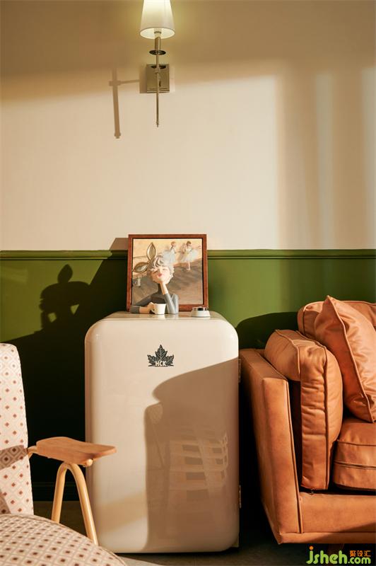 設(shè)計師運用冷暖色彩,在內(nèi)斂中尋求突破,整體以冷靜包容的復古綠為半墻基調(diào),結(jié)合溫暖跳躍的暖色,在畫框中演繹一幕又一幕碰撞與融合。