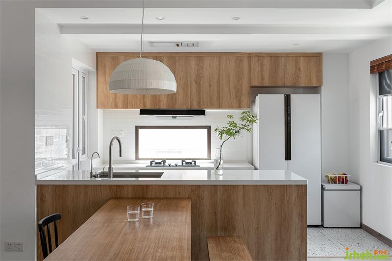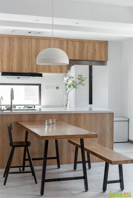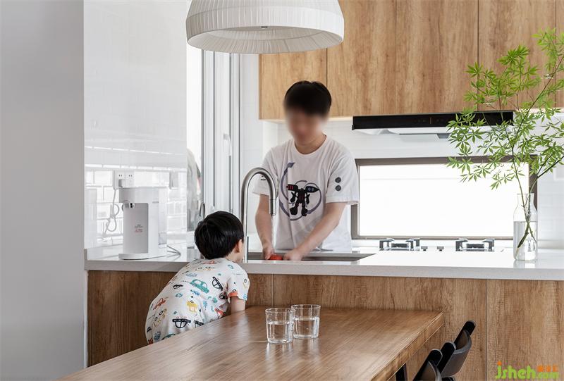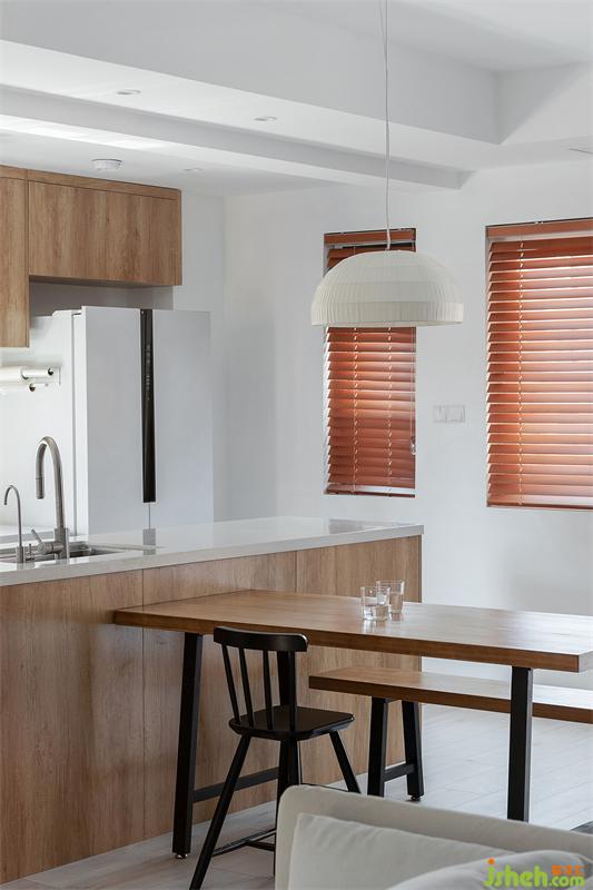 從玄關(guān)進(jìn)來便進(jìn)入整個(gè)空間的公共區(qū)域,我們希望達(dá)到空間的流動(dòng)感,拆掉了室內(nèi)大部分非承重墻體,重新規(guī)劃布局,餐廚空間與客廳并存,讓各個(gè)空間的關(guān)系更為互通互融。