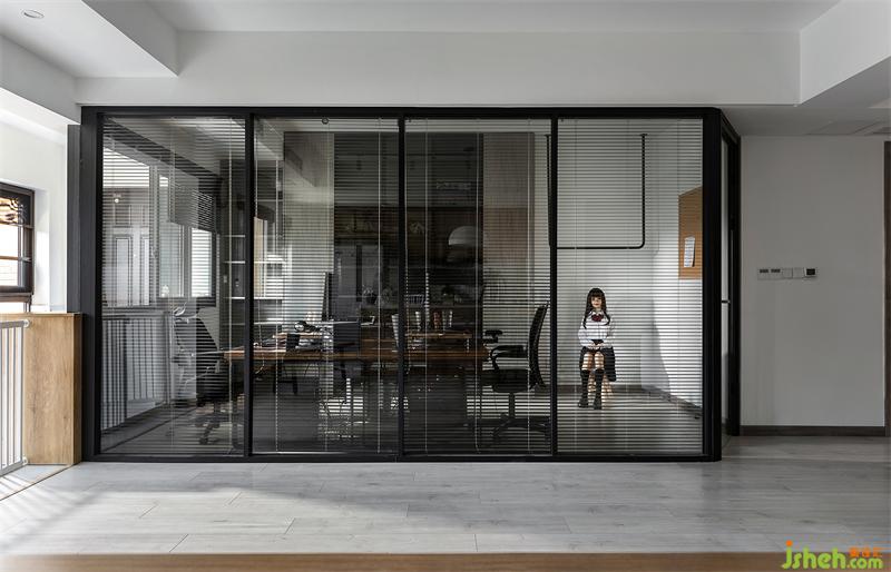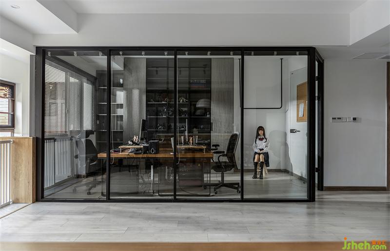工作室是屋主的創(chuàng)作區(qū)域,透明書柜內(nèi)放置漫畫書籍及手辦方便查找拿取,書柜一側(cè)懸掛的人形玩偶是負責姿勢與形體的“模特”。工作室與客廳之間用玻璃進行隔斷,形成半開放式的獨立工作區(qū),視線得到延伸,只需將百葉窗拉上,就可變?yōu)橐粋€私密的工作空間。