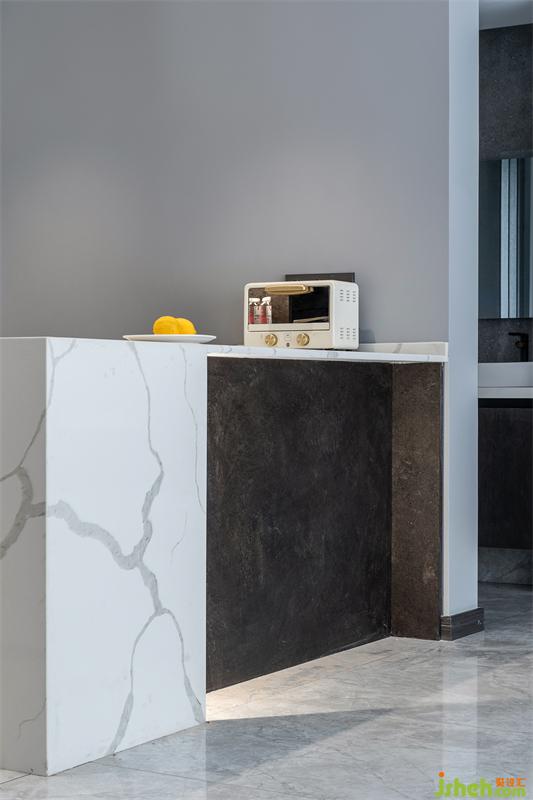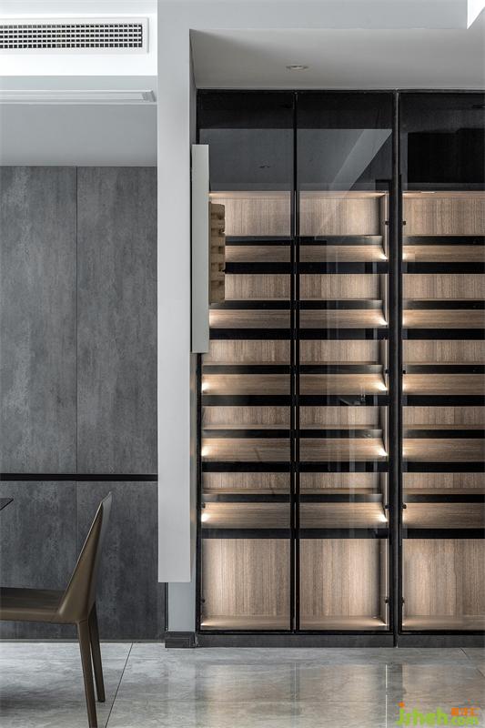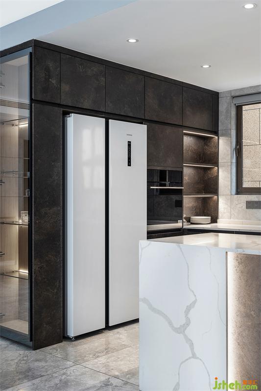 廚房巧妙利用空間設(shè)置酒柜,玻璃柜門,朦朧燈光,平添高級(jí)感。島臺(tái)通過(guò)設(shè)計(jì)比例構(gòu)成而定制。