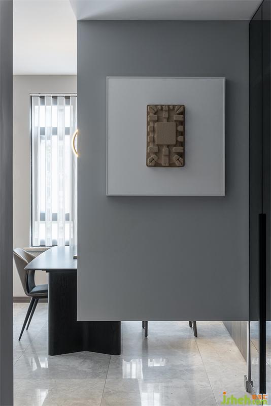 進(jìn)門即見(jiàn)鞋柜,玻璃柜門并暗藏?zé)魩?,增加夜晚歸家照明度的同時(shí),滿足業(yè)主展示多余的鞋品收藏。玄關(guān)懸空設(shè)計(jì),既形成空間切分,又有關(guān)聯(lián)空間的延伸感,畫作由設(shè)計(jì)師利用廢棄的包裝盒,通過(guò)特殊的制作工藝裝裱成畫,別具匠心。