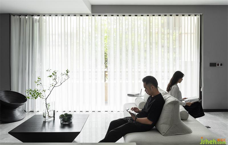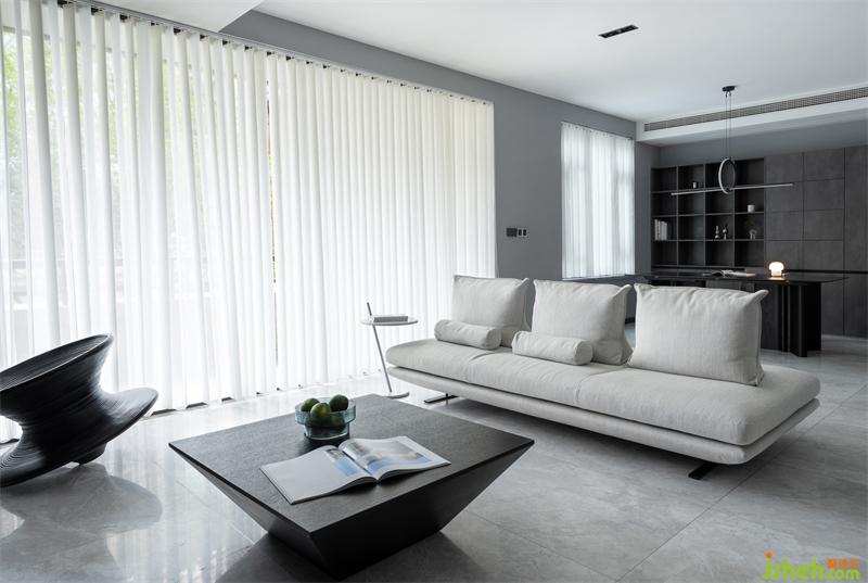 客廳的門窗采用折疊玻璃,想要近距離接觸大自然,可以完全折疊打開(kāi)。平時(shí)進(jìn)出陽(yáng)臺(tái)可以只打開(kāi)右側(cè)一扇,窗內(nèi)的豎百葉簾裝飾,通過(guò)陽(yáng)光照射讓整個(gè)空間更加靈動(dòng)。