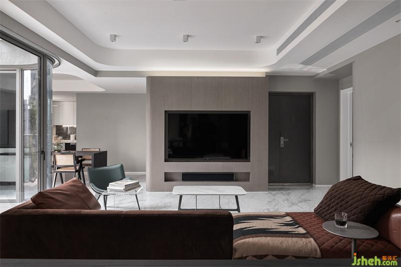 電視墻圓弧飾面,上方嵌入電視機(jī),下方暗藏B&O回音壁