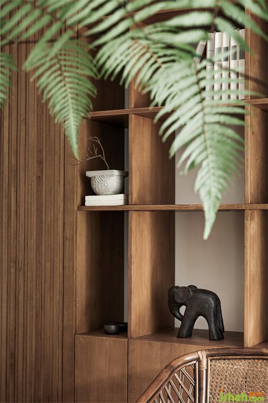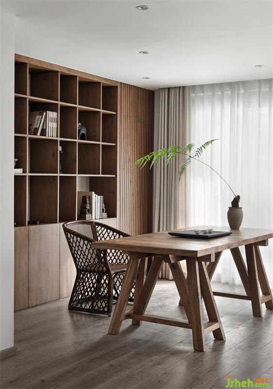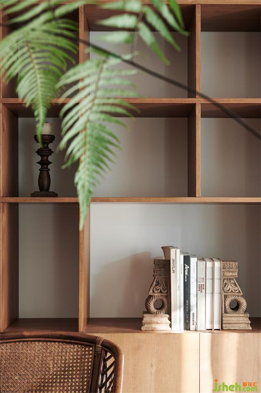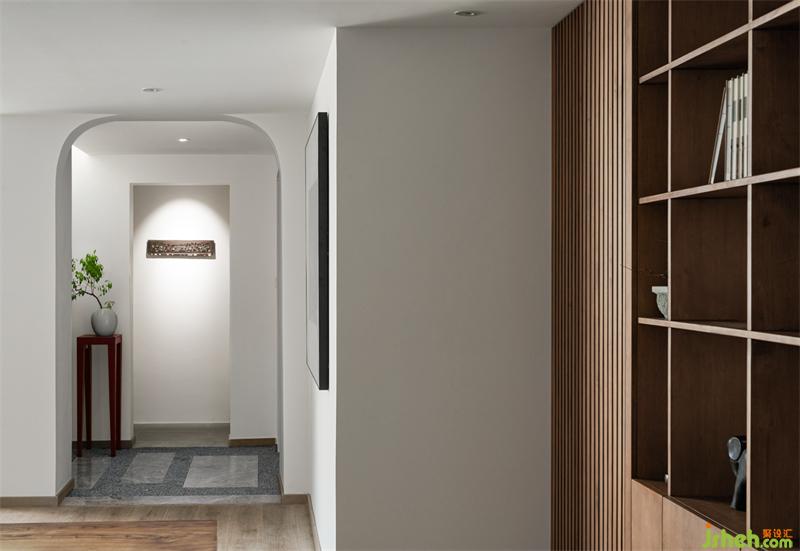 業(yè)主父母喜愛閱讀,我們?nèi)∠穗娨?,用書柜和書桌代替作為日常的休閑活動,書桌上置有茶臺,喝茶看書或沙發(fā)區(qū)閑坐聊天,每個日常都充滿愜意。書柜選用原木色和不規(guī)則隔板設(shè)計,沙發(fā)區(qū)背景使用留白的手法用冷靜的肌理石材調(diào)色,使得空間沉穩(wěn)。