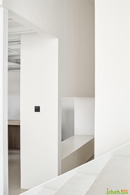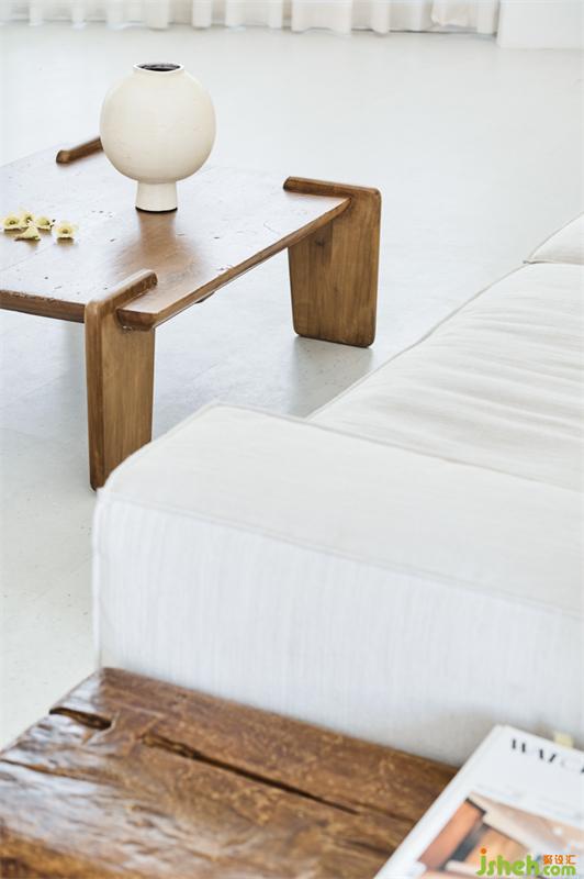 延續(xù)順應(yīng)的關(guān)鍵詞和設(shè)計師本身的喜好,空間選擇了大面積白的設(shè)計。白色涂料上墻,白色塊狀地膠做地,墻角處清水漆做一層耐擦洗的罩面處理,實現(xiàn)無踢腳設(shè)計;干凈純白的空間借助幾何線條打破空間的沉靜,使用適量的原木線條和木質(zhì)家具增加溫潤質(zhì)感。