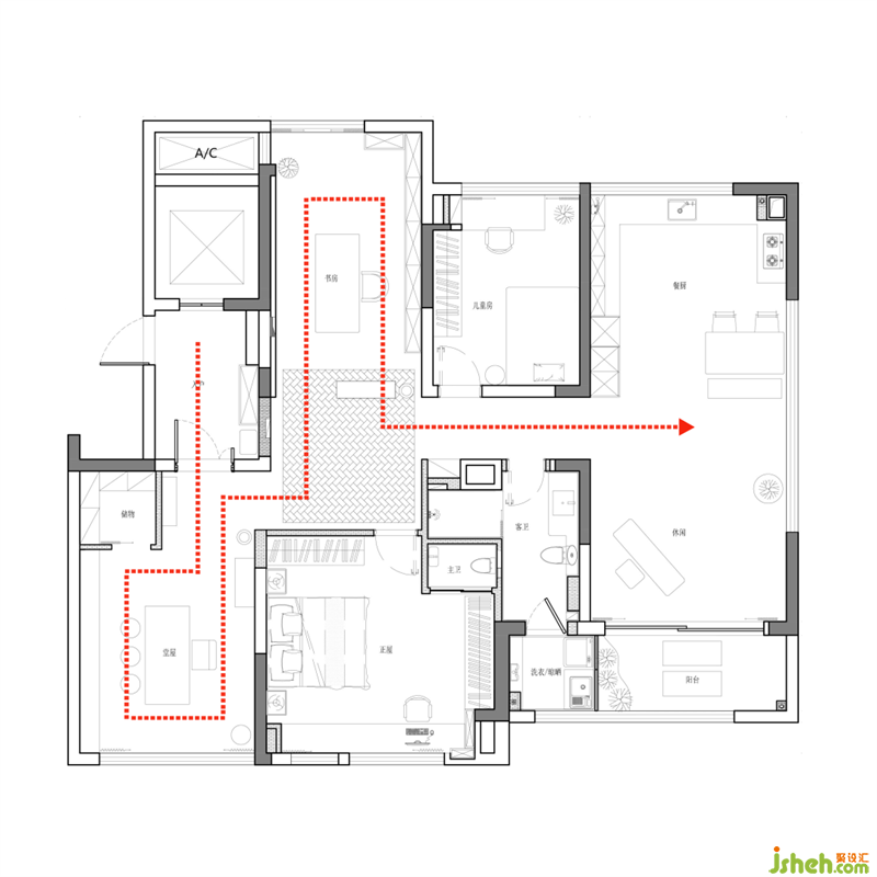 轉(zhuǎn)角處1㎡安放的“高架區(qū)”成為房屋的交通中心,底部能容納掃地機(jī)器人歸位、充電,上部預(yù)留中央Wi-Fi路由器,解決功能需求。