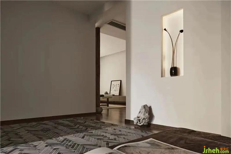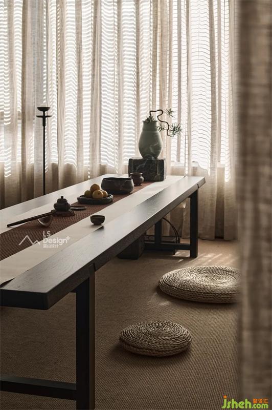 在洄游動(dòng)線(xiàn)中,合理分隔開(kāi)公區(qū)與私區(qū)的距離,經(jīng)過(guò)玄關(guān)、茶室,慣性般望向客廳的視線(xiàn)被建筑體框限,下意識(shí)給予空間主人充分的尊重。