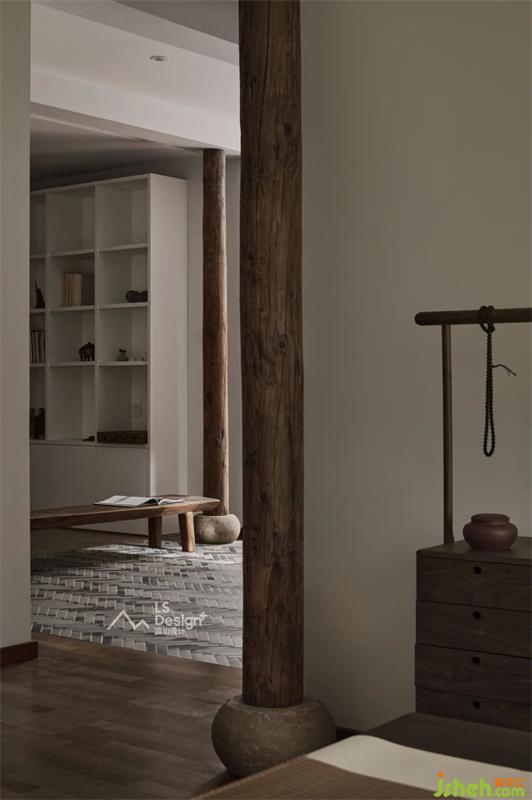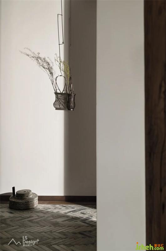 人字青磚鋪設(shè)中庭,打破方正結(jié)構(gòu)的同時(shí)給空間鍍上一層懷舊的質(zhì)感。于空間中與石鼓、木質(zhì)的碰撞,讓靜謐的氛圍活添了一份跳躍,在光影變化中,仿佛看到隨歲月變遷的自然與生趣。