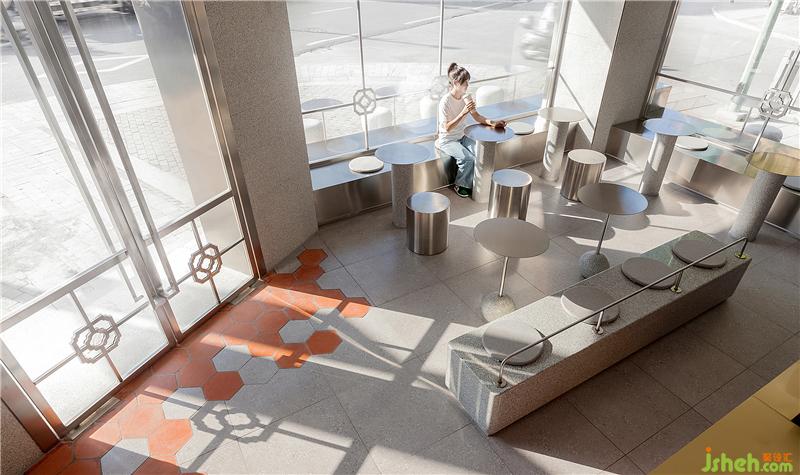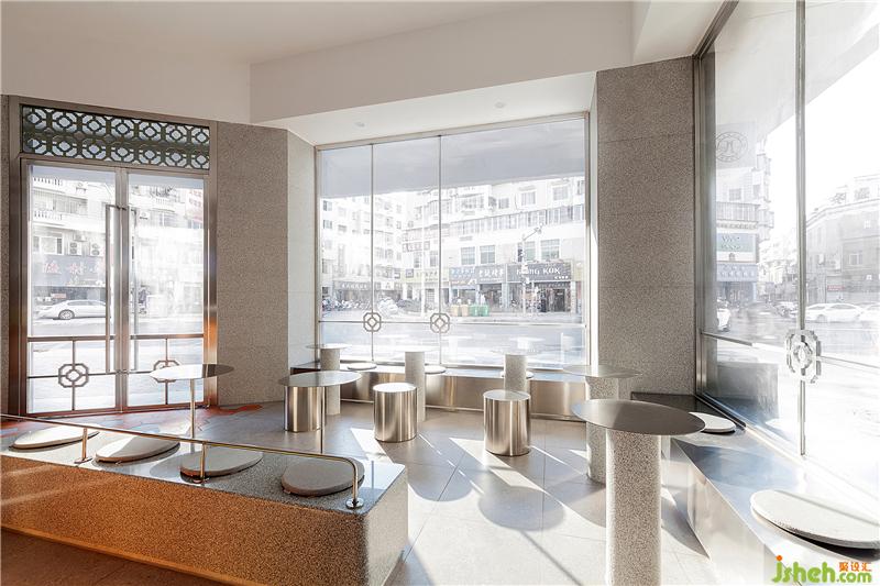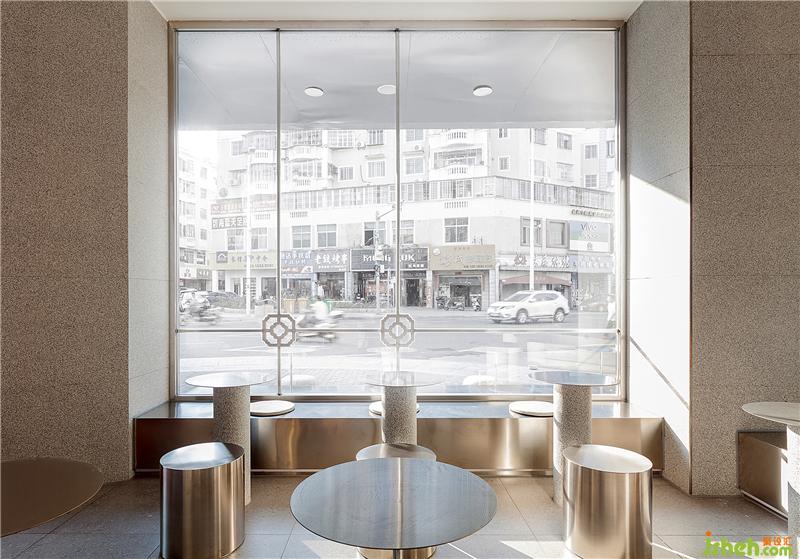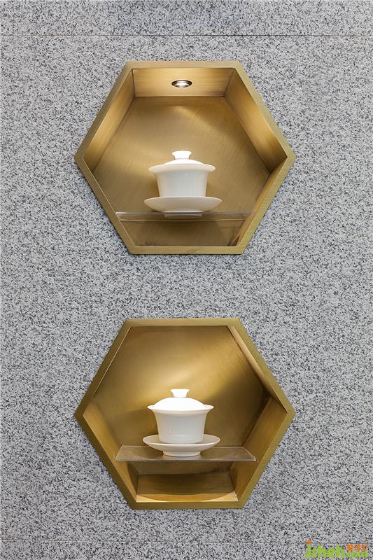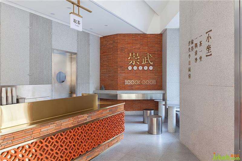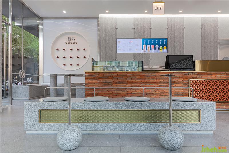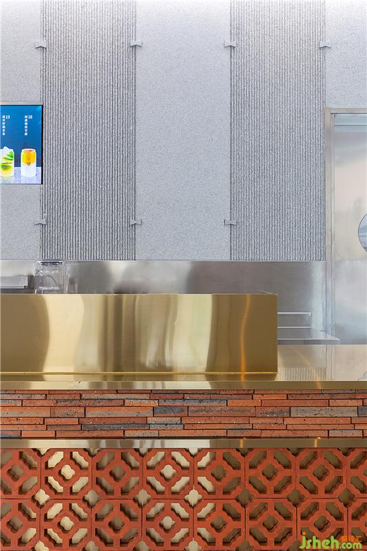 傳統(tǒng)的閩南花格與現(xiàn)代灰冷的鋼板相互碰撞,精致復(fù)古的黃銅元素點(diǎn)綴,以及花崗巖背景墻板間的卯榫石扣件等等,都在深度挖掘一種閩南傳統(tǒng)建筑元素與年輕化的設(shè)計(jì)語言相結(jié)合的新式閩南茶飲空間。