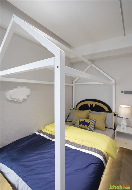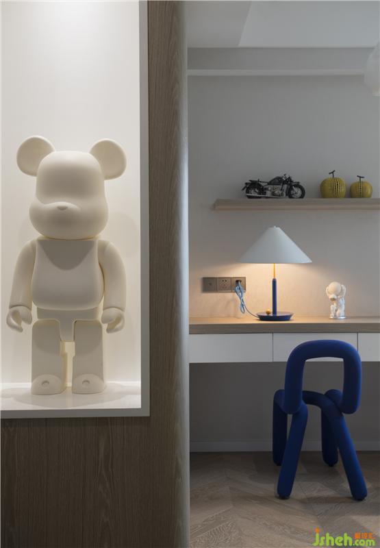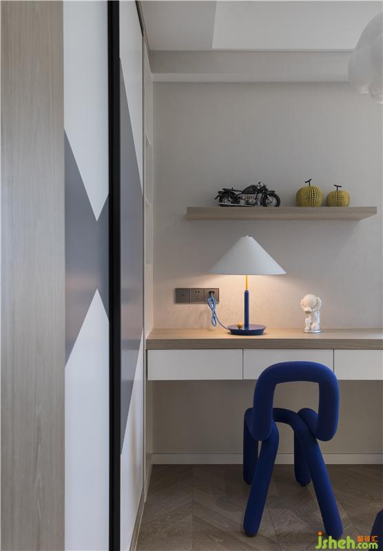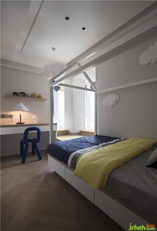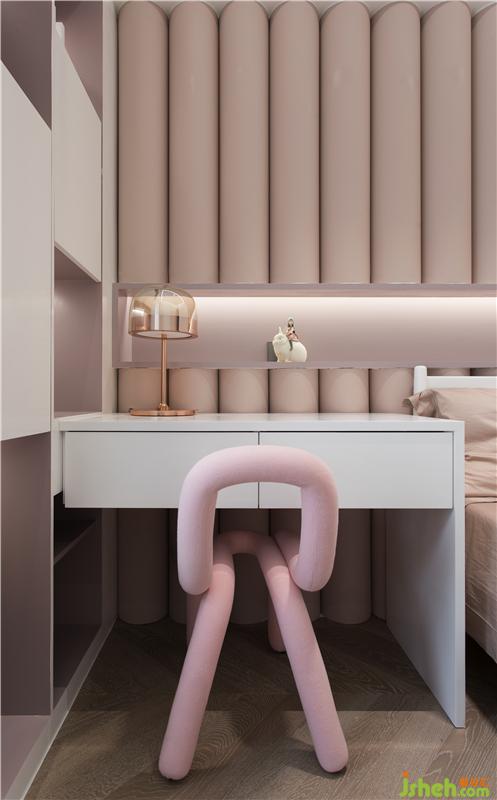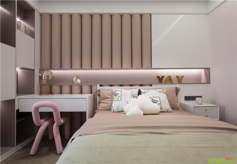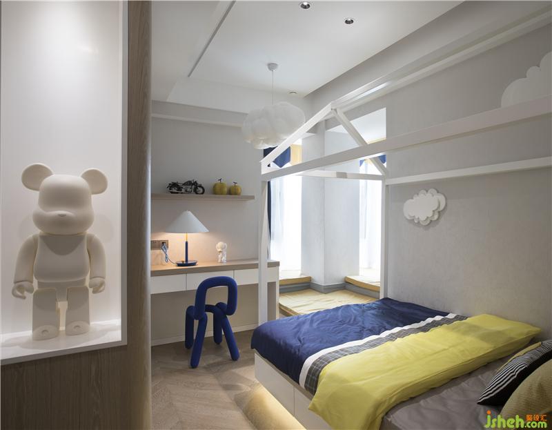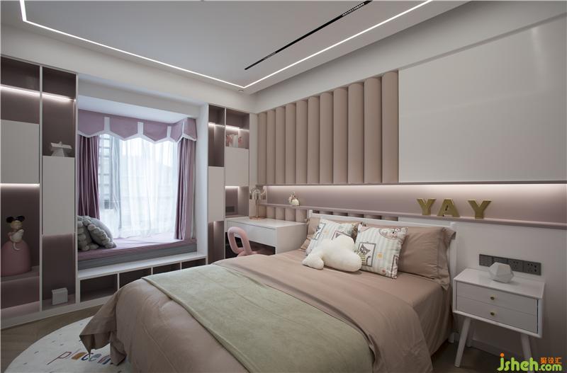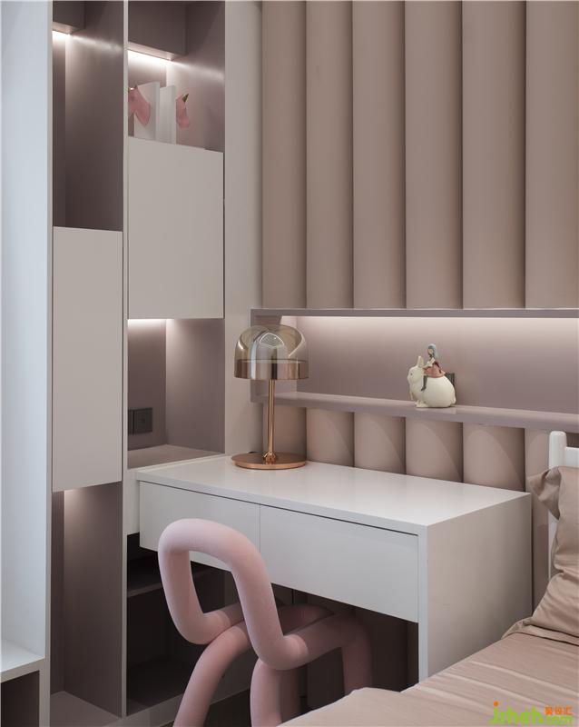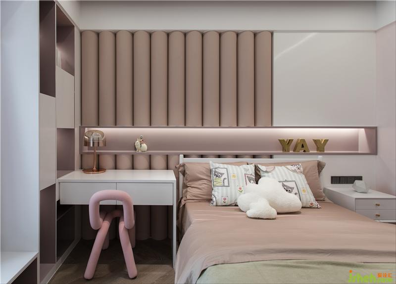 主臥與次臥空間顏色延續(xù)著原木色與淺灰的搭配,以低飽和度色系組成,予人冷靜安謐的視覺感受。男孩房與女孩房的空間設(shè)計主線則為童真,空間充滿了甜美、溫柔和純真,符合兒童的純真性格和美好幻想。