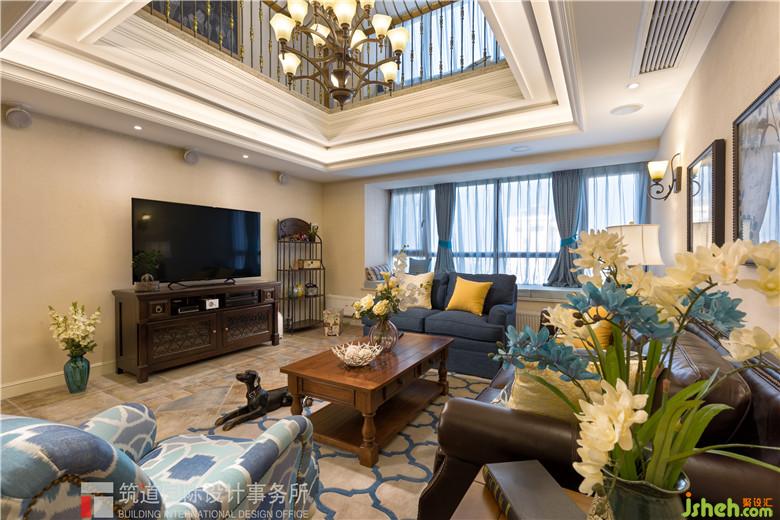 空間色調(diào)以大地色為基礎(chǔ),營(yíng)造了家的溫馨的基調(diào)。軟裝以深淺藍(lán)色幾何圖案沙發(fā)和地毯搭配明黃色抱枕,再佐以經(jīng)典美式風(fēng)格的咖色真皮沙發(fā)及做舊實(shí)木家具,顏色對(duì)比明亮活躍,讓整體空間充滿美式風(fēng)格又不失活力。