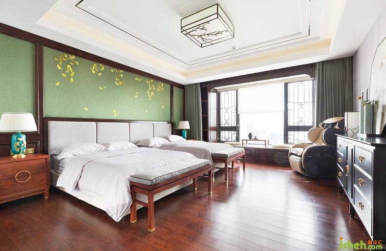 傳統(tǒng)竹青色的臥室背景墻躍然眼前,銀杏葉成為空間中最吸睛的發(fā)光體,這充滿生命張力的色彩藝術(shù),營(yíng)造出純凈的氛圍,關(guān)乎著冥想和夢(mèng)境。
