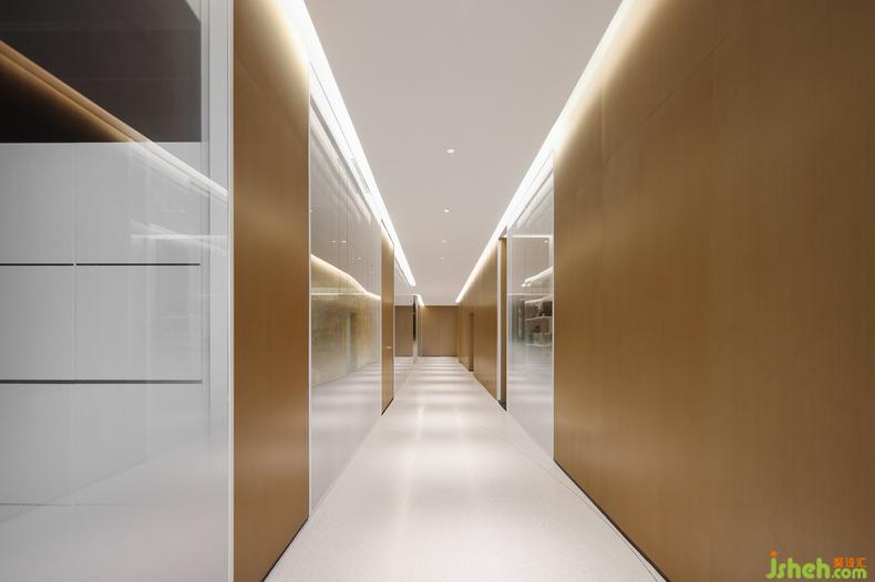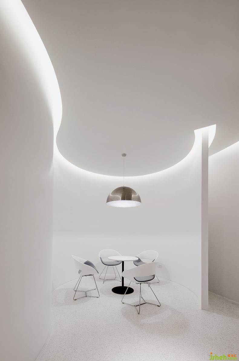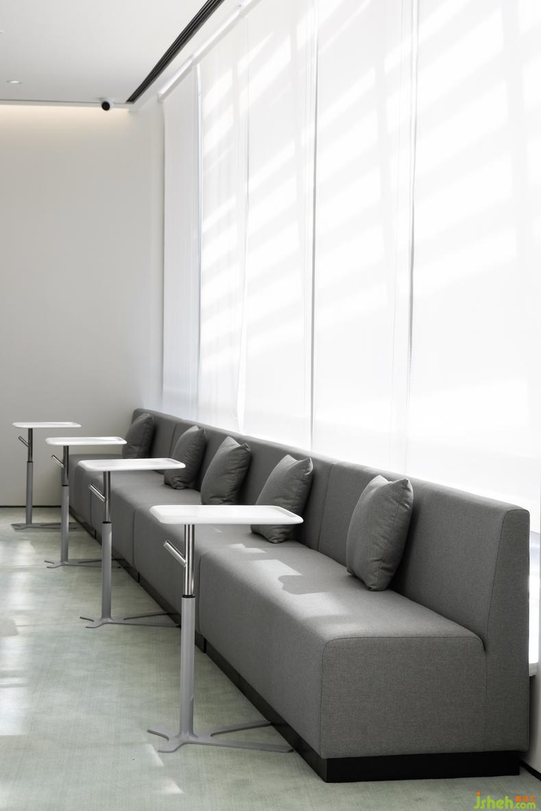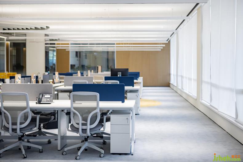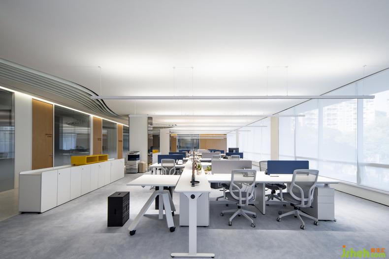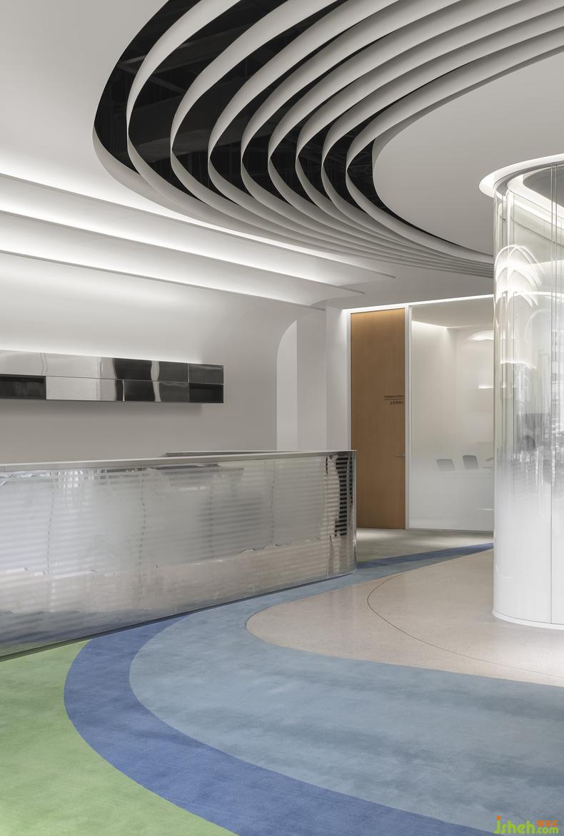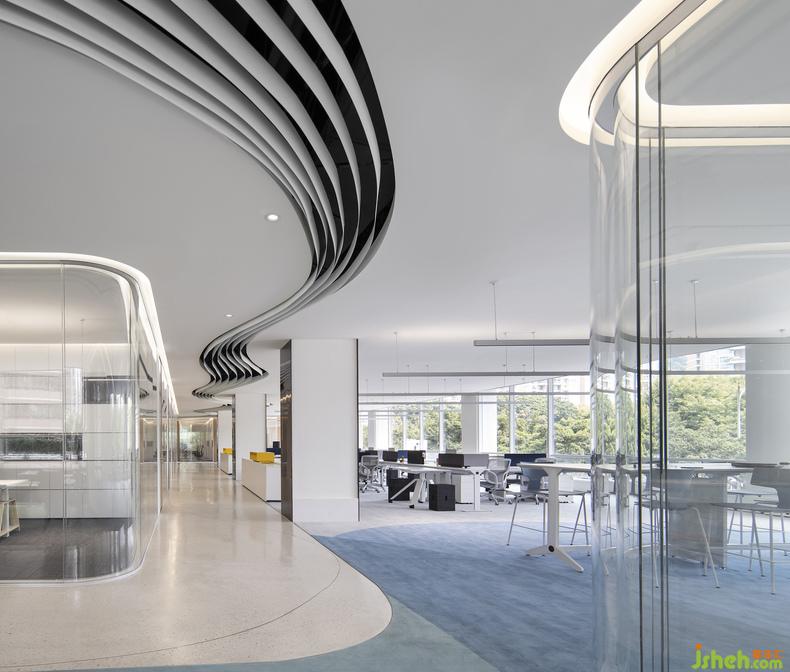 地面的設(shè)計(jì)與材質(zhì)也呼應(yīng)了天花的流線造型,總部辦公設(shè)計(jì)嵌入銅線的水磨石與顏色柔和的塊毯分割了辦公區(qū)與公共走道的界限,它們以飄逸的姿態(tài)貫穿了整個(gè)場地,也讓辦公區(qū)域與休閑接待區(qū)有了柔和而自然的銜接。地毯覆蓋的區(qū)域就像為人們營造出一個(gè)舒適且精致的島嶼。無論是獨(dú)自工作與思考,抑或和同事進(jìn)行頭腦風(fēng)暴,還是下午茶閑暇時(shí)的漫步,人們都能在這兼具共享與私人空間中感受到這是一間充滿活力的辦公空間。
